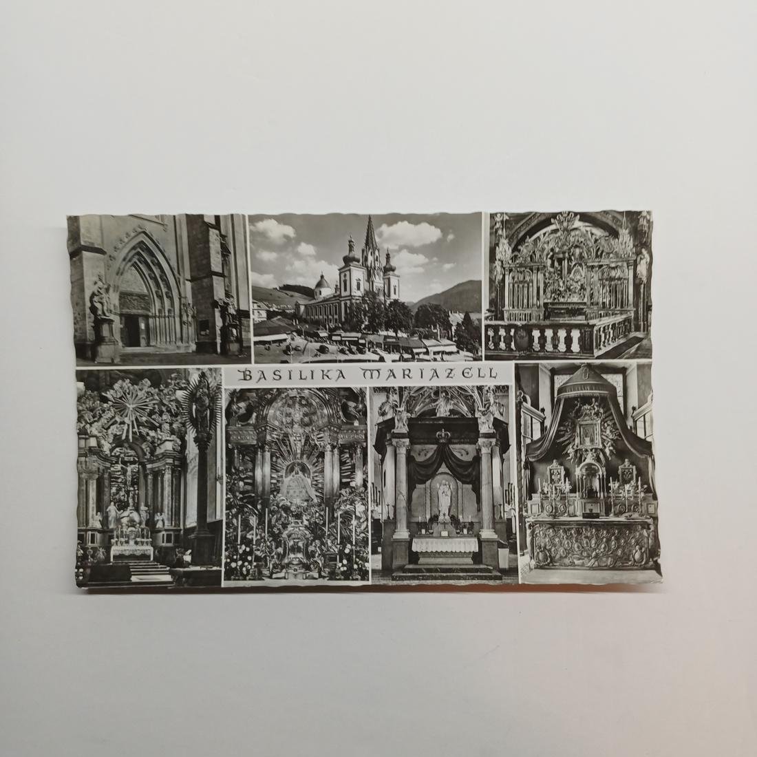 Η vintage καρτ ποστάλ απεικονίζει τη Βασιλική του Μαριατσέλ (Basilika Mariazell) στην Αυστρία, έναν από τους σημαντικότερους τόπους προσκυνήματος στην Ευρώπη. Χρονολογείται στο δεύτερο μισό του 20ού αιώνα. (μπροστινή όψη)