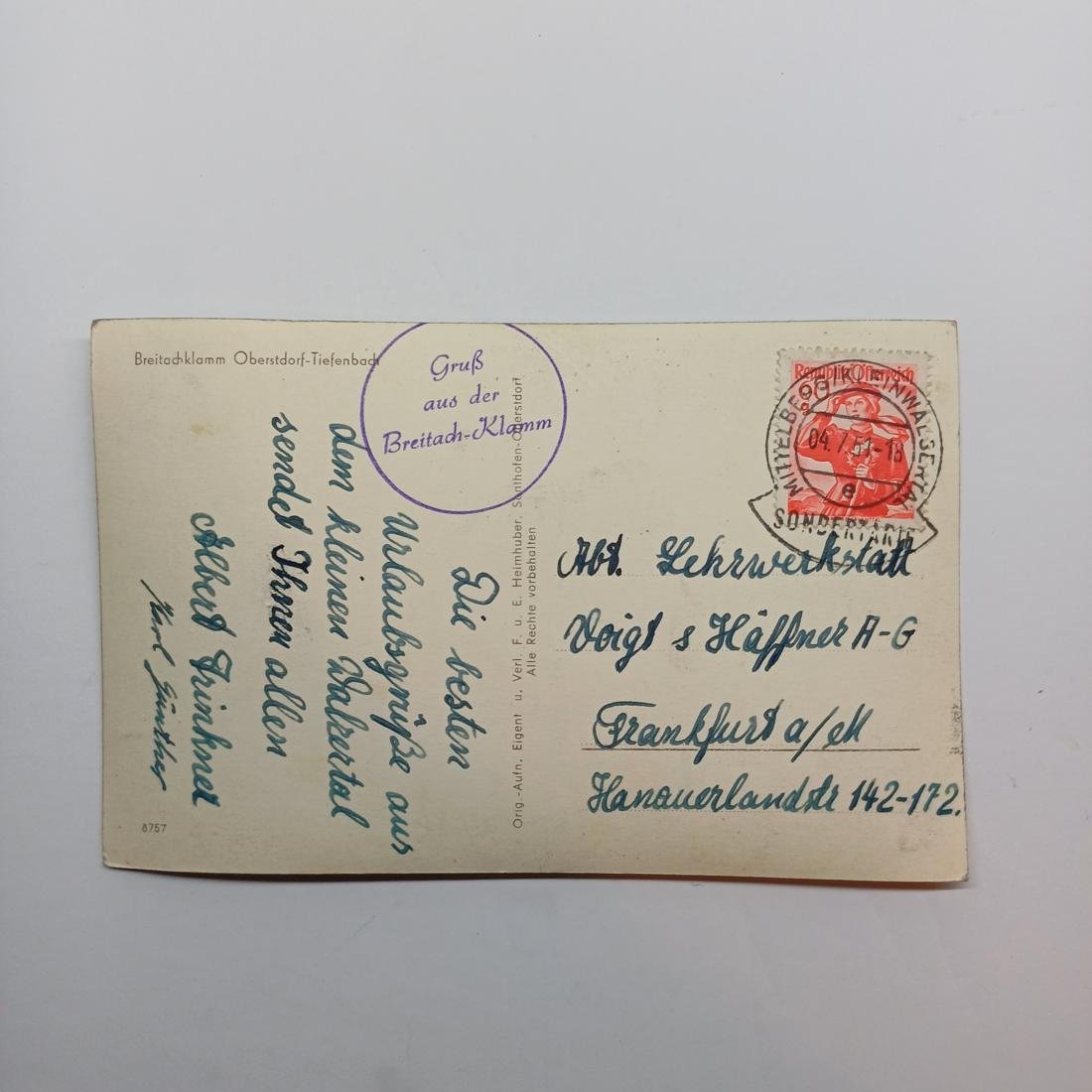 Η vintage καρτ ποστάλ απεικονίζει ένα φαράγγι στην περιοχή Allgäu της Βαυαρίας της Γερμανίας, κοντά στην πόλη Oberstdorf και εκτείνεται προς την κοιλάδα Kleinwalsertal της Αυστρίας. Χρονολογείται στα μέσα του 20ου αιώνα. (μπροστινή όψη)