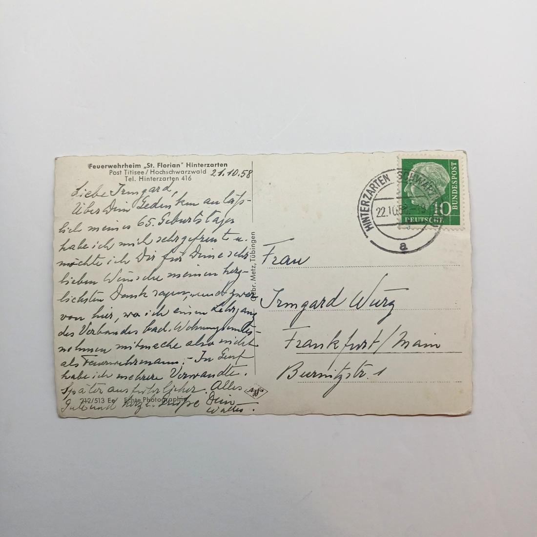 Η vintage καρτ ποστάλ απεικονίζει με θέα το Feuerwehrheim St. Florian (Σπίτι Πυροσβεστών Αγίου Φλωριανού) στο Χίντερτσαρτεν (Hinterzarten) στην Γερμανία. Χρονολογείται στα μέσα του 20ού αιώνα. (μπροστινή όψη)