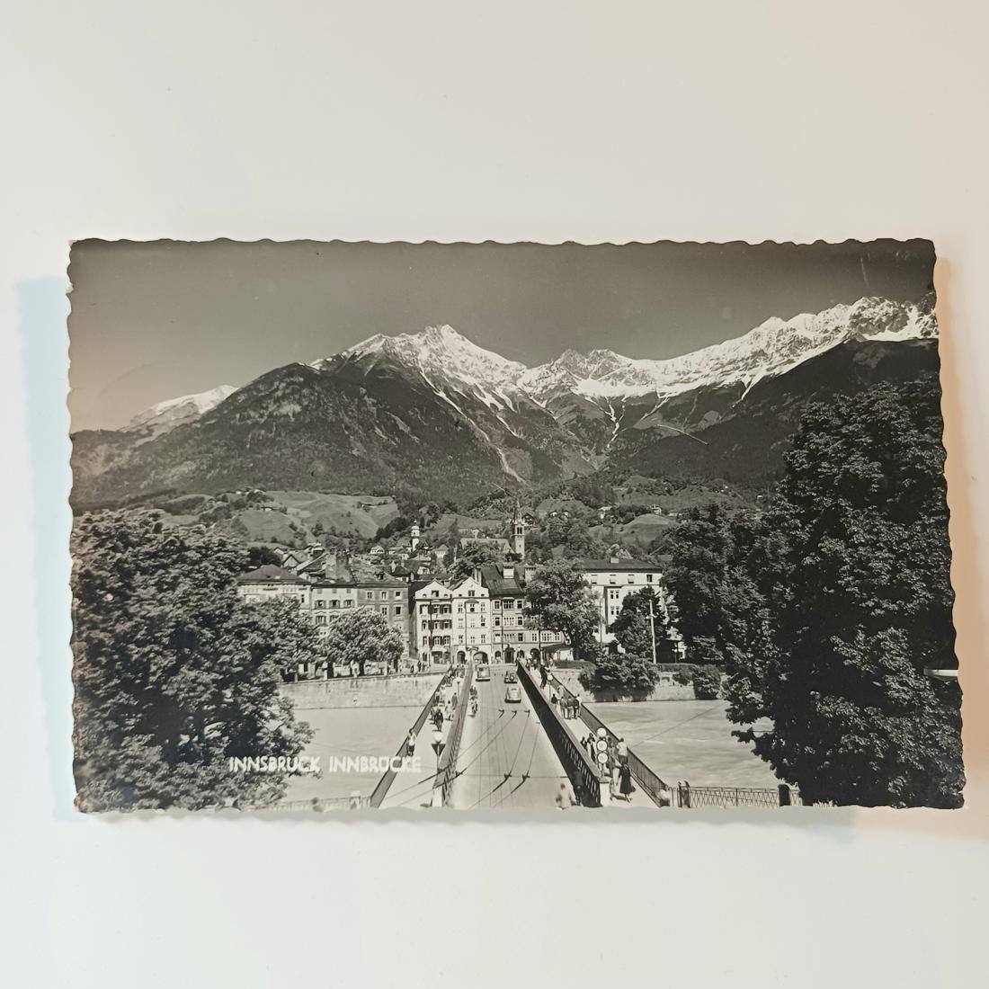 Η vintage καρτ ποστάλ απεικονίζει την πόλη του Ίνσμπρουκ και τη γέφυρα Innbrücke στην Αυστρία. Χρονολογείται στα μέσα του 20ού αιώνα. (μπροστινή όψη)