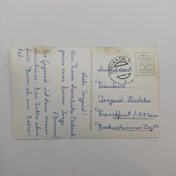 Αναγράφεται προσωπική σημείωση μαζί με μία σφραγίδα και ένα γραμματόσημο (χρονολ. 1954). (πίσω όψη)