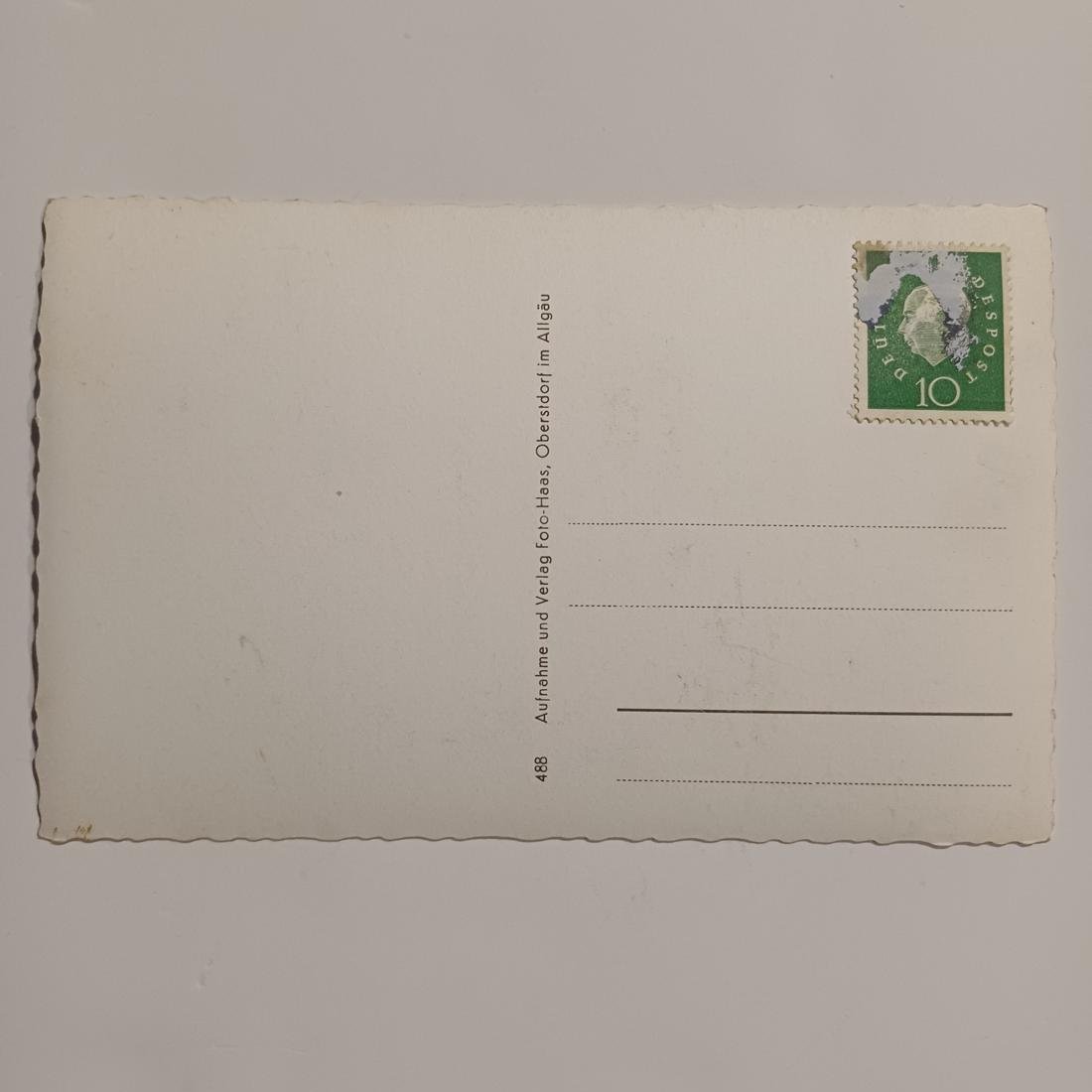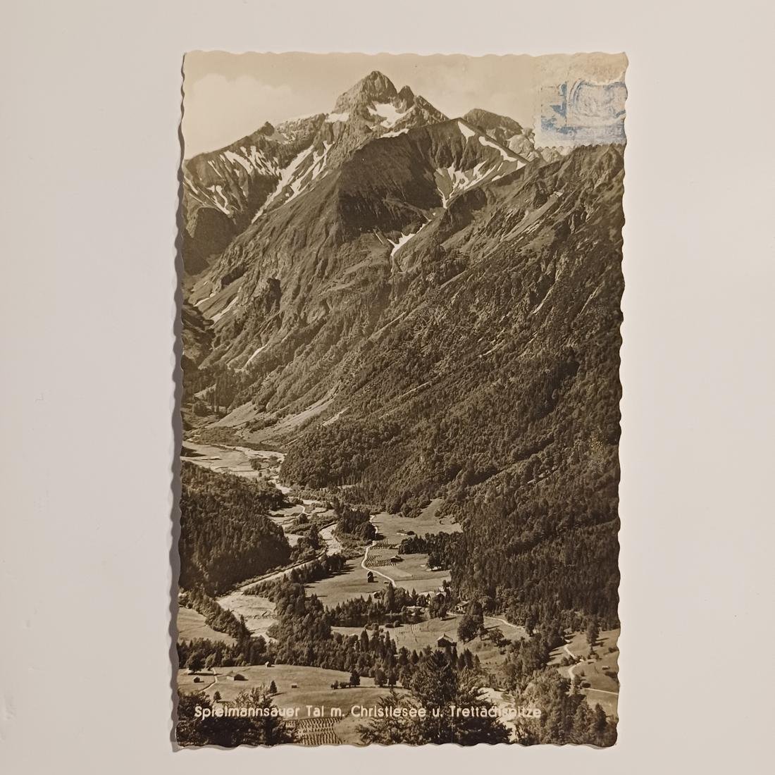 Η vintage καρτ ποστάλ απεικονίζει την κοιλάδα Spielmannsauer (Spielmannsauer Tal), τη λίμνη Christlesee και την κορυφή Trettachspitze στις Άλπεις Allgäu της Γερμανίας. Χρονολογείται στα μέσα του 2οού αιώνα. (μπροστινή όψη)