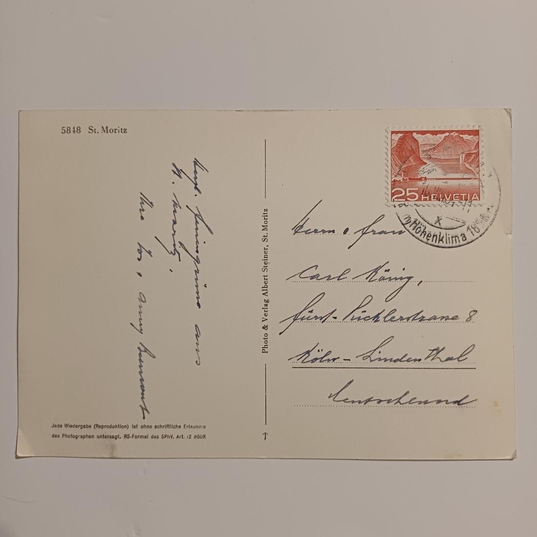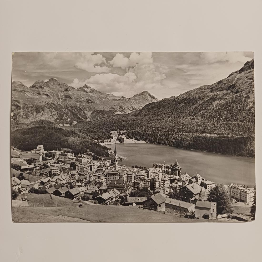 Η vintage καρτ ποστάλ απεικονίζει το Σεντ Μόριτζ (St. Moritz) στην Ελβετία. Χρονολογείται στο δεύτερο μισό του 20ού αιώνα. (μπροστινή όψη)