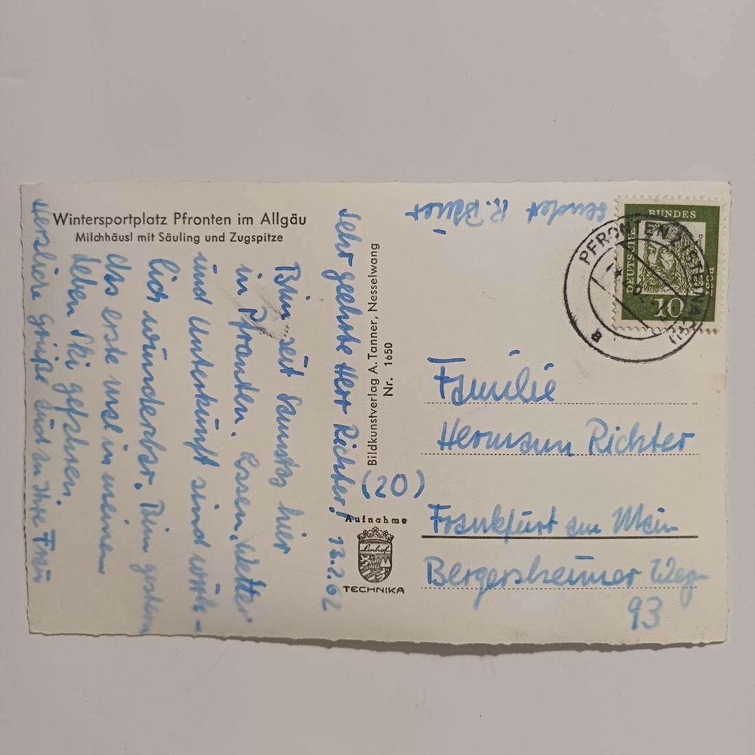Η vintage καρτ ποστάλ απεικονίζει το χιονοδρομικό κέντρο Pfronten από το “Milchhäusl” στην Γερμανία, με φόντο τα βουνά Säuling και Zugspitze. Χρονολογείται στο δεύτερο μισό του 20ού αιώνα. (μπροστινή όψη)