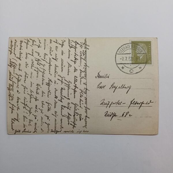 Αναγράφεται προσωπική σημείωση μαζί με μία σφραγίδα και ένα γραμματόσημο. (πίσω όψη)