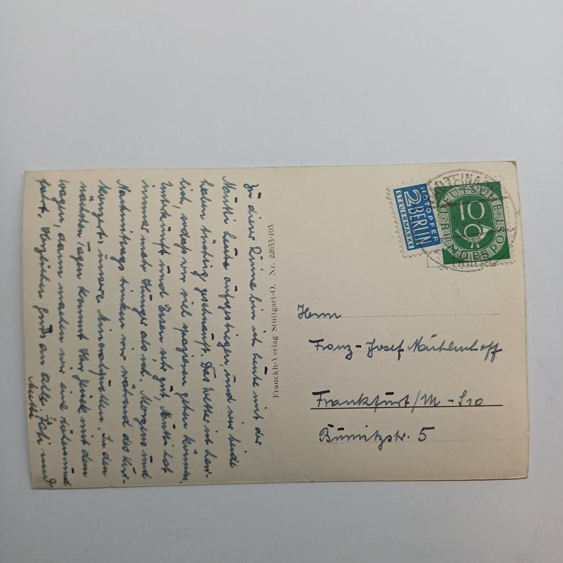 Η vintage καρτ ποστάλ απεικονίζει ένα ποίημα με τίτλο “Zavelstein”, γραμμένο από τον Γερμανό ποιητή J. V. v. Scheffel και συνδυάζει μια φωτογραφία του Κάστρου Zavelstein στο Bad Teinach-Zavelstein του Μαύρου Δάσους της Γερμανίας με το κείμενο του ποιήματος. Χρονολογείται στο δεύτερο μισό του 20ού αιώνα. (μπροστινή όψη)