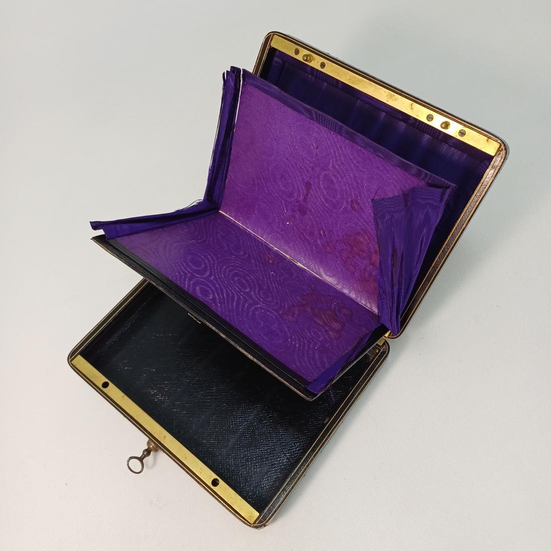 Vintage κασετίνα- πορτοφόλι με διαχωριστικά σε μωβ χρώμα. Έχει δερμάτινη επένδυση και φέρει μηχανισμό κλειδώματος. Χρονολογείται στο πρώτο μισό του 20ού αιώνα και φέρει φθορές στα εσωτερικά χωρίσματα λόγω παλαιότητας. Οι διαστάσεις του είναι 18,5 x 15,5 cm.