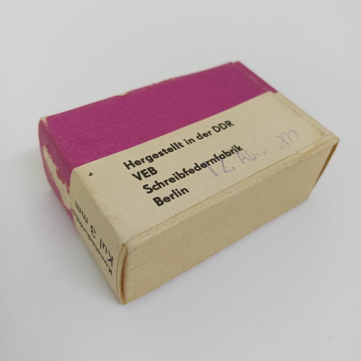 Vintage κουτί το οποίο περιέχει μύτες καλλιγραφίας με την ονομασία Kunstschrift-Federn, κατασκευασμένες στο Βερολίνο. Το κουτί αναγράφει “Hergestellt in der DDR VEB Schreibfederfabrik Berlin” το οποίο σημαίνει “Κατασκευασμένο στη ΛΔΓ (Λαϊκή Δημοκρατία της Γερμανίας) VEB Εργοστάσιο Στυλό Βερολίνο”. Επίσης, αναγράφεται η χρονολογία 1972.