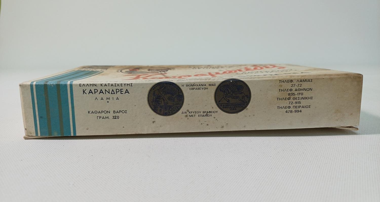 Το κουτί από τους κουραμπιέδες είναι της εταιρείας “Εμμ. Καρανδρέας” με έδρα τη Λαμία. Οι διαστάσεις του είναι 22 x 12 x 4 cm. Στο πλάι φέρει τίτλους διάκρισης ποιότητας των προϊόντων της εταιρείας από τη Διεθνή Έκθεση Θεσσαλονίκης του 1936.