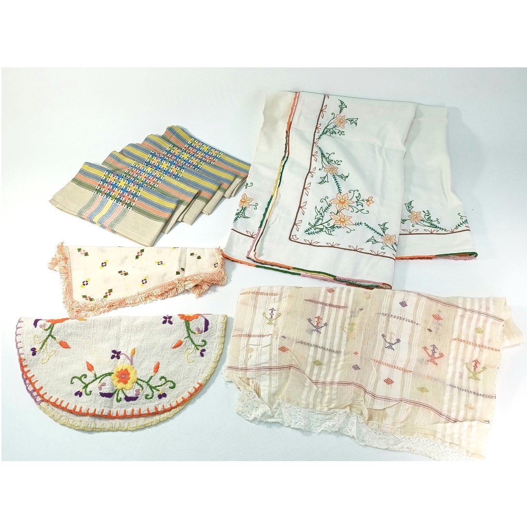 9 vintage λευκά είδη διαφόρων ειδών. To LOT αποτελείται από: 1) 5 πετσέτες κουζίνας, διαστάσεων 46 * 47 cm, 2) 1 σεμέν με κεντημένα σχέδια, διαστάσεων 47 * 34 cm, 3) 1 στρογγυλό σεμέν με κεντήματα λουλουδιών, διαμέτρου 42 cm, 4) 1 τραβέρσα με δαντελωτό τελείωμα στις 2 πλευρές, διαστάσεων 0,52 * 1,33 m. και 5) 1 τραπεζομάντηλο, διαστάσεων 1,35 * 1,60 m.