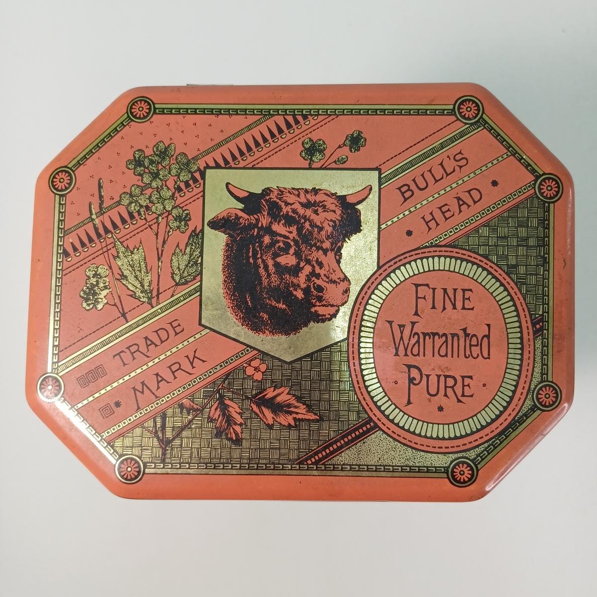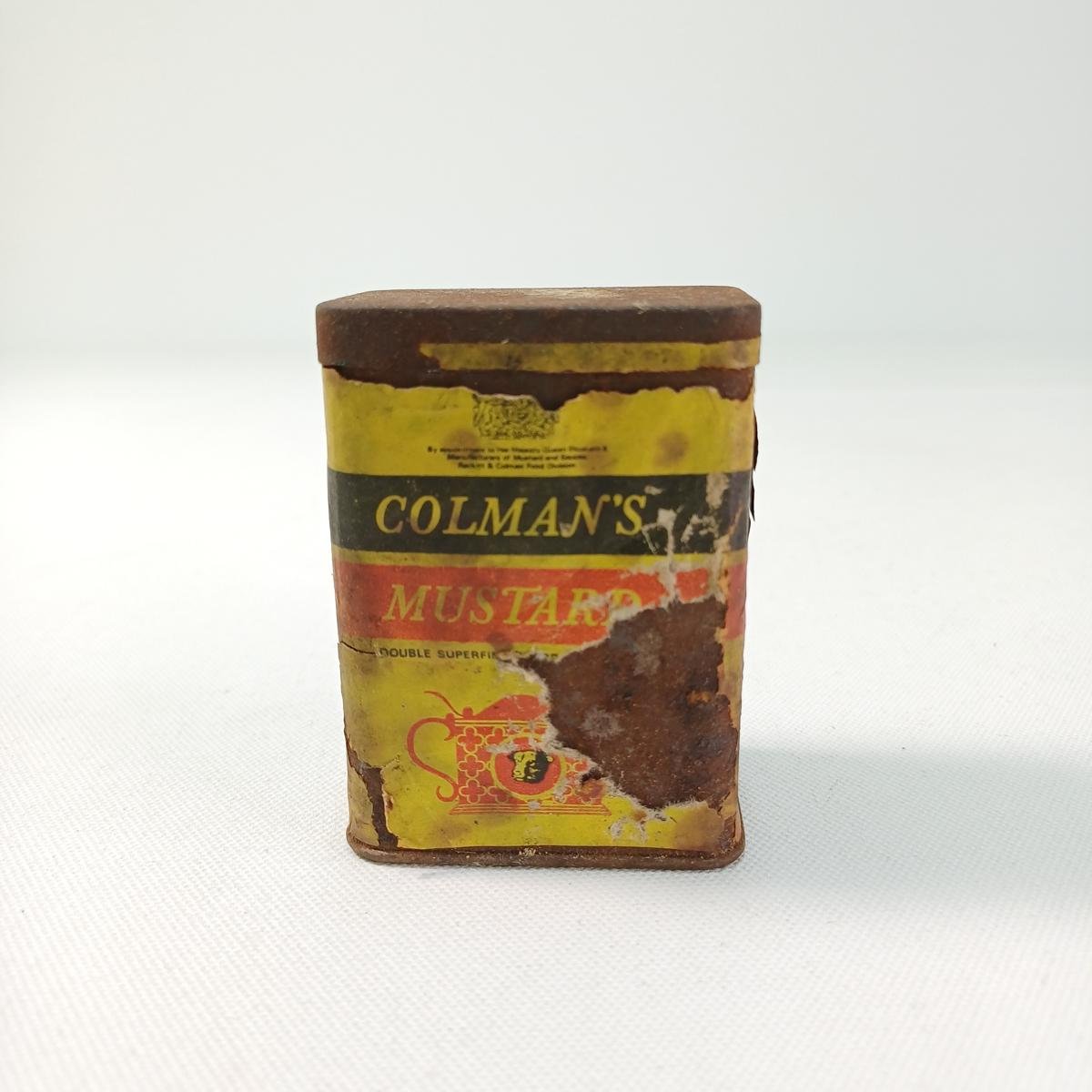 Το μεγάλο κουτί πιθανώς ήταν διαφημιστικό της επωνυμίας και αναγράφει: “Colman’s Mustard- Trade Mark- Bull’s head” και χρονολογείται περί τις δεκαετίες 1970-’80. Είναι σε αρκετά καλή κατάσταση με μικρές φθορές στο μέταλλο. Οι διαστάσεις του είναι 13,5 *10,5 *18 cm.
