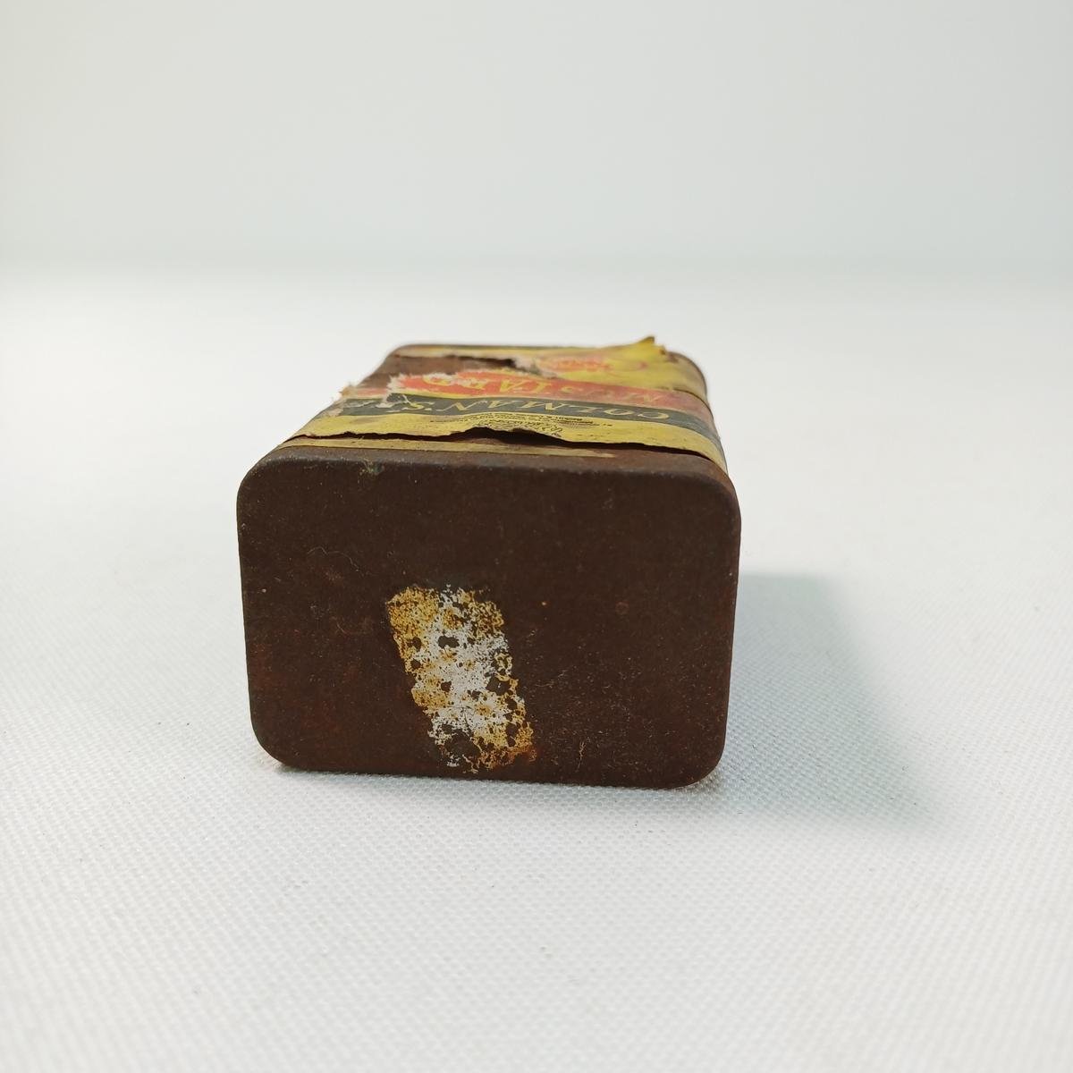 Το μικρό κουτί περιείχε προϊόν της εταιρείας και χρονολογείται πριν τη δεκαετία ’70. Οι διαστάσεις του είναι 5 * 3,5 * 7 cm και υπάρχει παρουσία σκουριάς λόγω παλαιότητας.