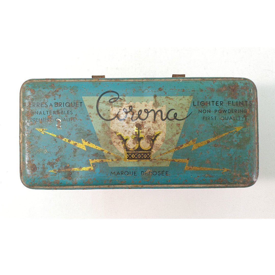 Vintage μεταλλικό κουτί από τσακμακόπετρες με την επωνυμία “CORONA”, κατασκευασμένα στην Ελλάδα, με ετικέτες γραμμένες στα Γαλλικά και στα Αγγλικά.