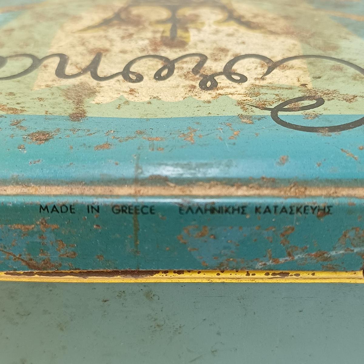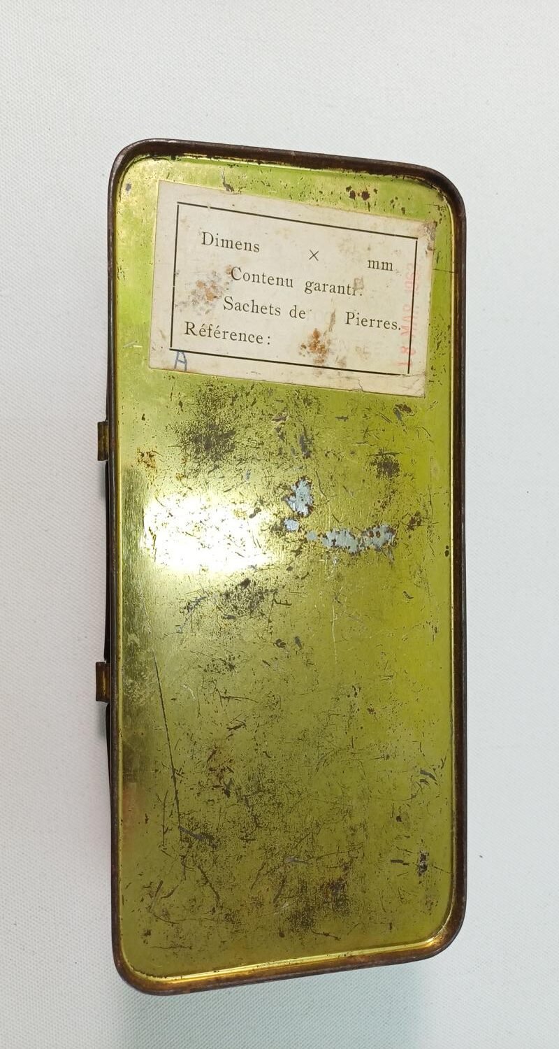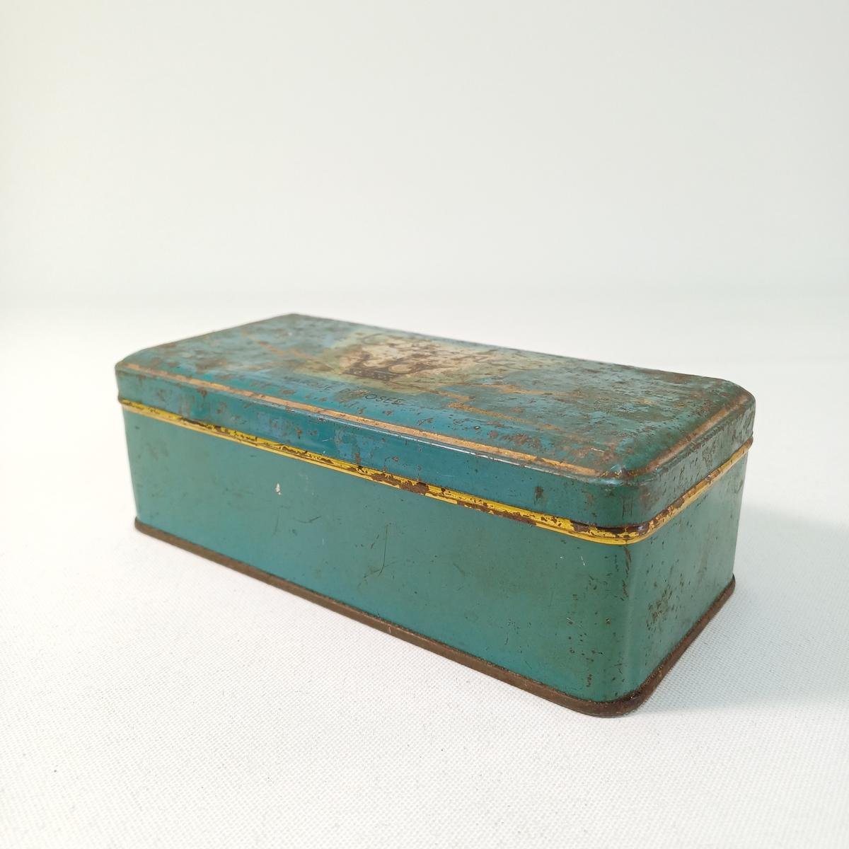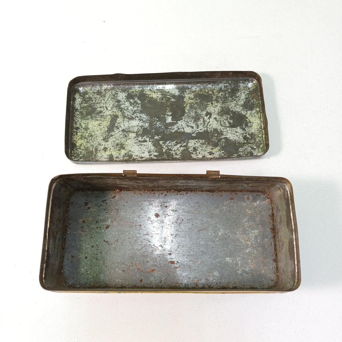 Το μέταλλο του κουτιού φέρει φθορές λόγω παλαιότητας καθώς χρονολογείται στις δεκαετίες 1950-’60. Οι διαστάσεις του είναι 19 * 9,5 * 6 cm.
