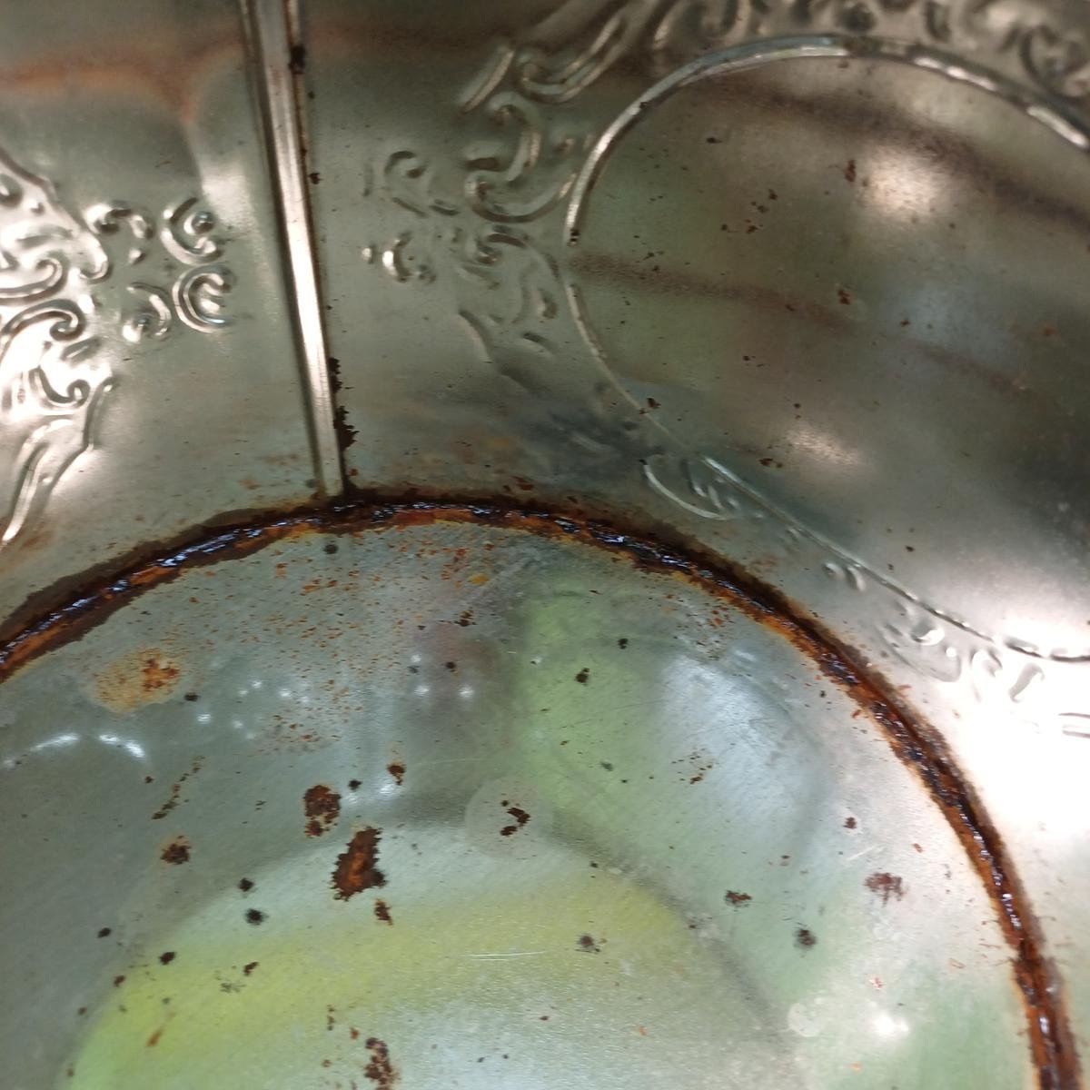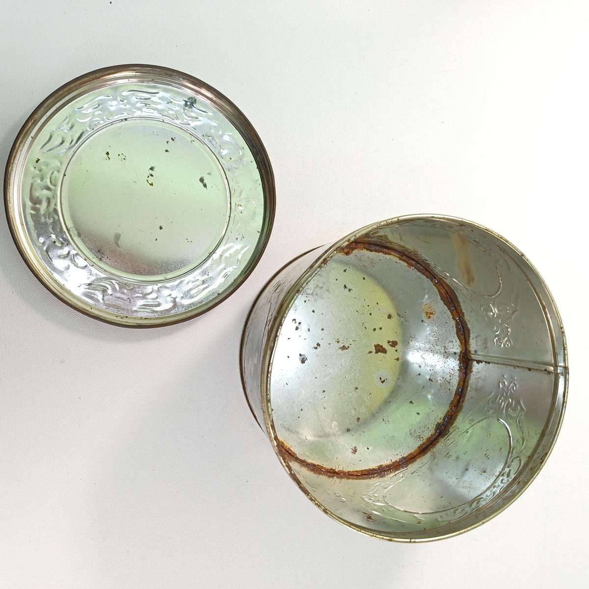 Το μέταλλο του κουτιού έχει υποστεί οξείδωση λόγω παλαιότητας. Η διάμετρός του είναι 18 cm και το ύψος του 14 cm.