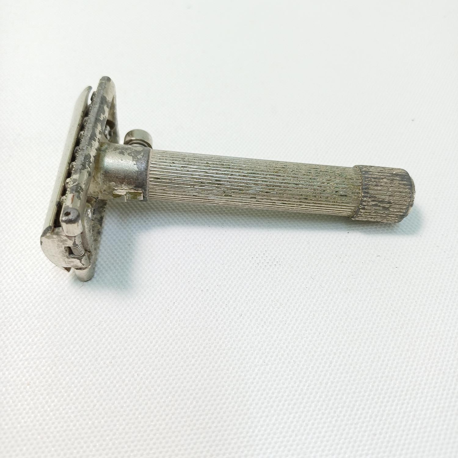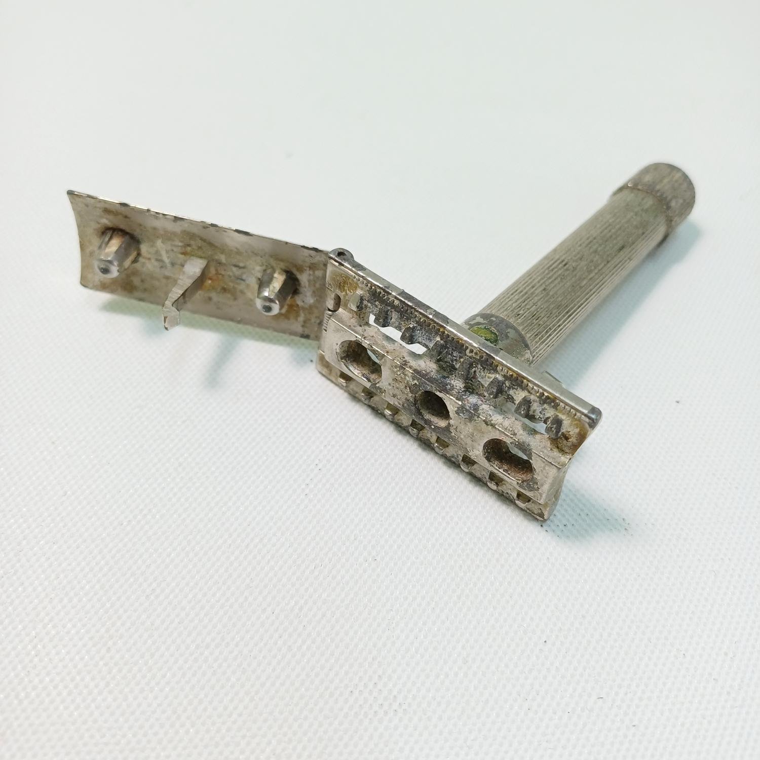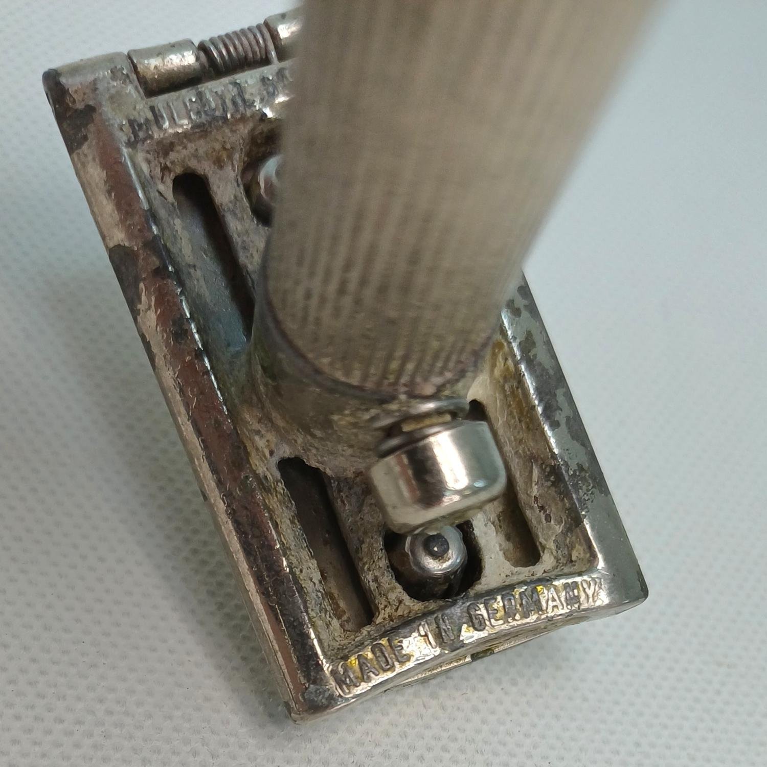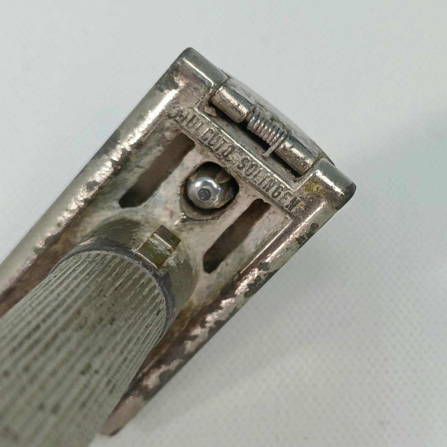Vintage ξυραφάκι ξυρίσματος Γερμανικής κατασκευής με την επωνυμία ‘Mulcuto Solingen’. Είναι μια παλιά μάρκα ξυραφιών που κατασκευάστηκε από την εταιρεία Paul Muller & Co στη Σόλινγκεν της Γερμανίας περίπου την περίοδο 1920-1925. Τα ξυραφάκια ασφαλείας είναι γνωστά για την αποτελεσματικότητά τους και την ανθεκτικότητά τους. Είναι μεταχειρισμένο και υπάρχει φθορά στο μέταλλο λόγω παλαιότητας. Το μήκος του είναι 8,5 cm.
