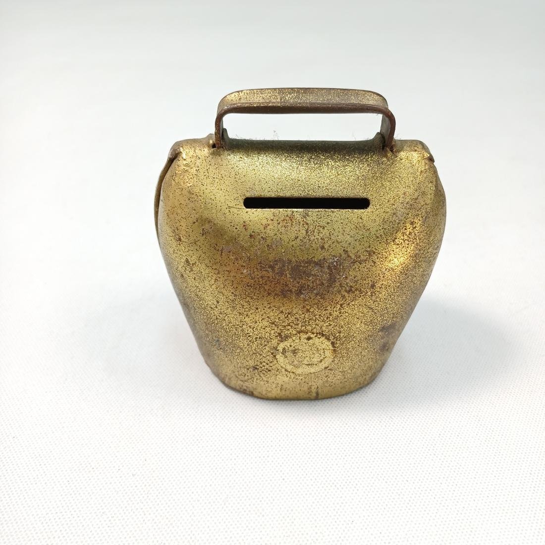 Vintage ορειχάλκινος κουμπαράς σε σχήμα κουδούνας. Στην κάτω μεριά υπάρχει το άνοιγμα (χωρίς το κλειδί).