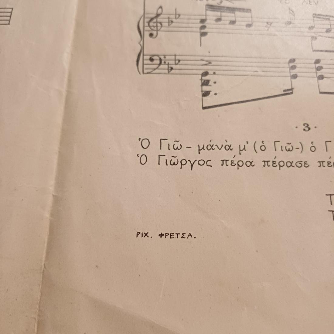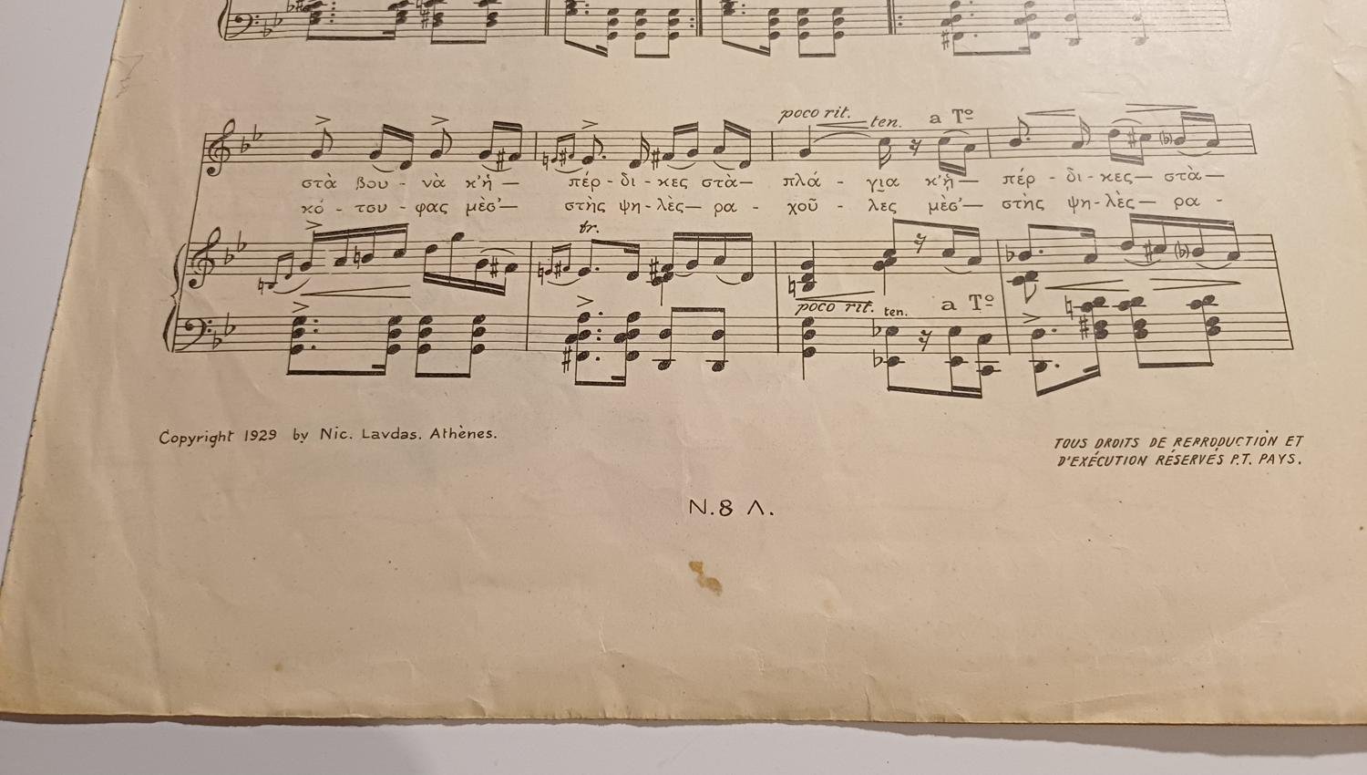 Η σπάνια vintage παρτιτούρα “Δημοτικά Τραγούδια” (Σειρά Πρώτη), διασκευάστηκε για τραγούδι και πιάνο (ή βιολί, μαντολίνο) από τον Ν. Λάβδα σε συνεργασία με τον Ριχ. Φρέτσα. Η παρτιτούρα είναι για το τραγούδι «Το λεν’ οι κούκοι στα βουνά», σε Α’ εκτέλεση από τον κ. Αντ. Καλαμπούση σε συναυλία της Αθηναϊκής Μανδολινάτας στις 20 Απριλίου 1924. Η έκδοση έγινε από τον Μουσικό Οίκο Γαϊτάνου στην Αθήνας το 1929. Οι διαστάσεις είναι 35,5 x 25,5 cm και έχει 4 σελίδες.