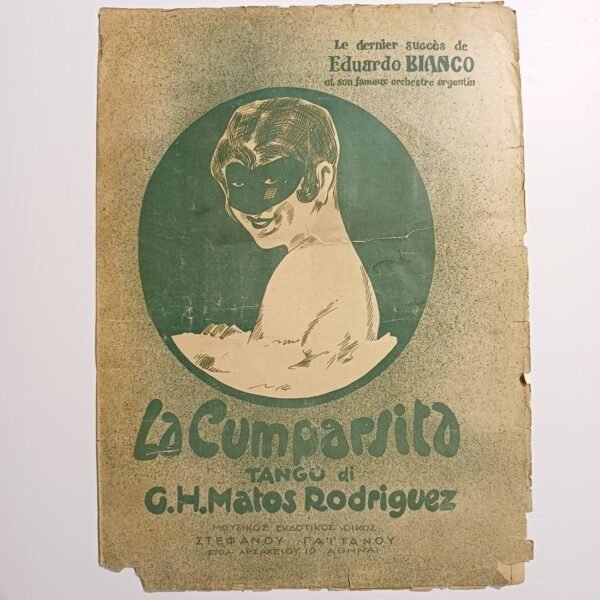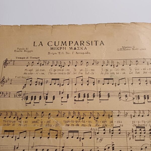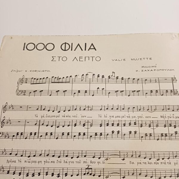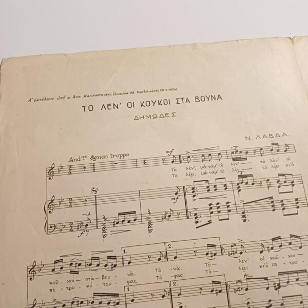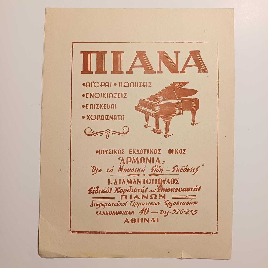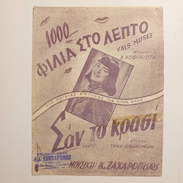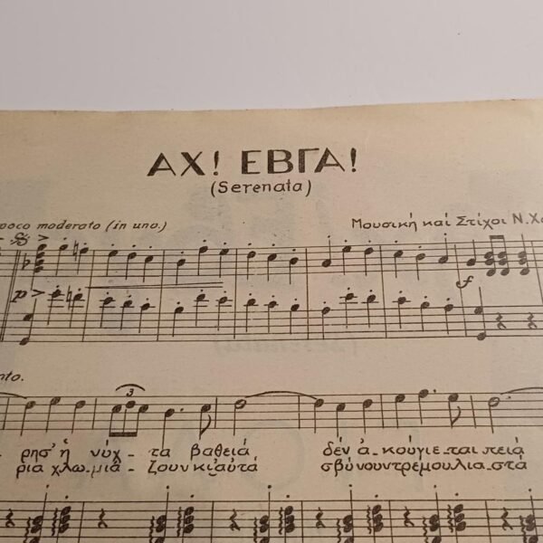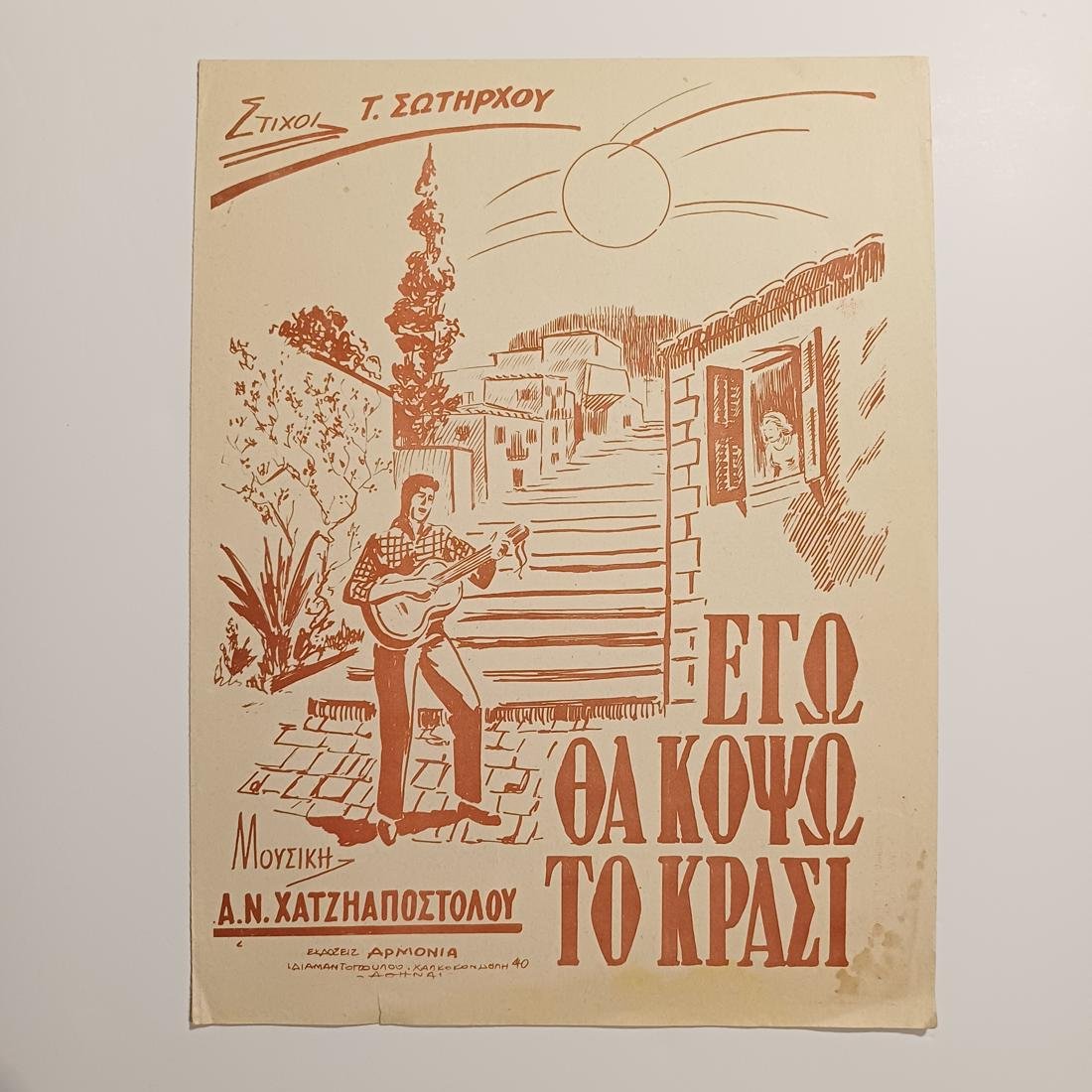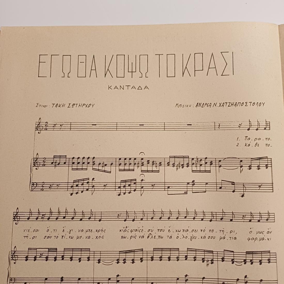 Σπάνια vintage παρτιτούρα “Εγώ θα κόψω το κρασί”. Οι στίχοι είναι του Τ. Σωτήρχου και η μουσική του Α.Ν. Χατζηαποστόλου. Εκδόθηκε από τις εκδόσεις Αρμονία, στην Αθήνα. Οι διαστάσεις είναι 31,5 x 24 cm και έχει 4 σελίδες.