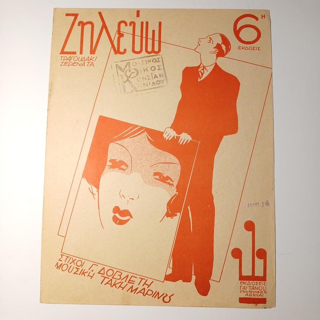 Σπάνια vintage παρτιτούρα “Ζηλεύω” σε στίχους του Γ. Δοβλέτη και μουσική του Τάκη Μαρίνου. Πρόκειται για την 6η έκδοση του έργου, η οποία κυκλοφόρησε από τις εκδόσεις Γαϊτάνου στην Αθήνα, το 1935. Οι διαστάσεις είναι 32 x 24 cm και έχει 4 σελίδες.
