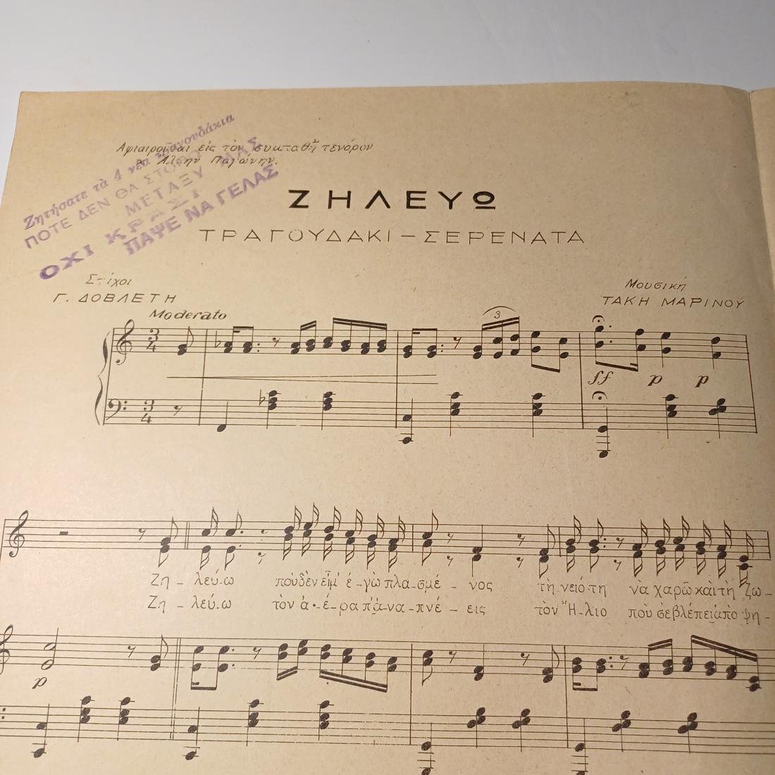 Vintage παρτιτούρα “Ζηλεύω” Τάκης Μαρίνος (1935).