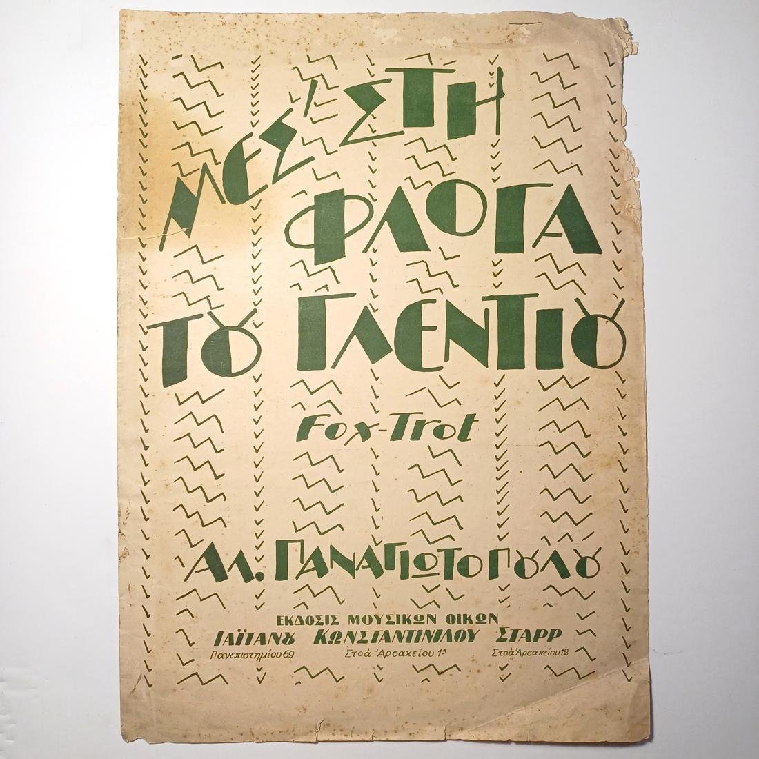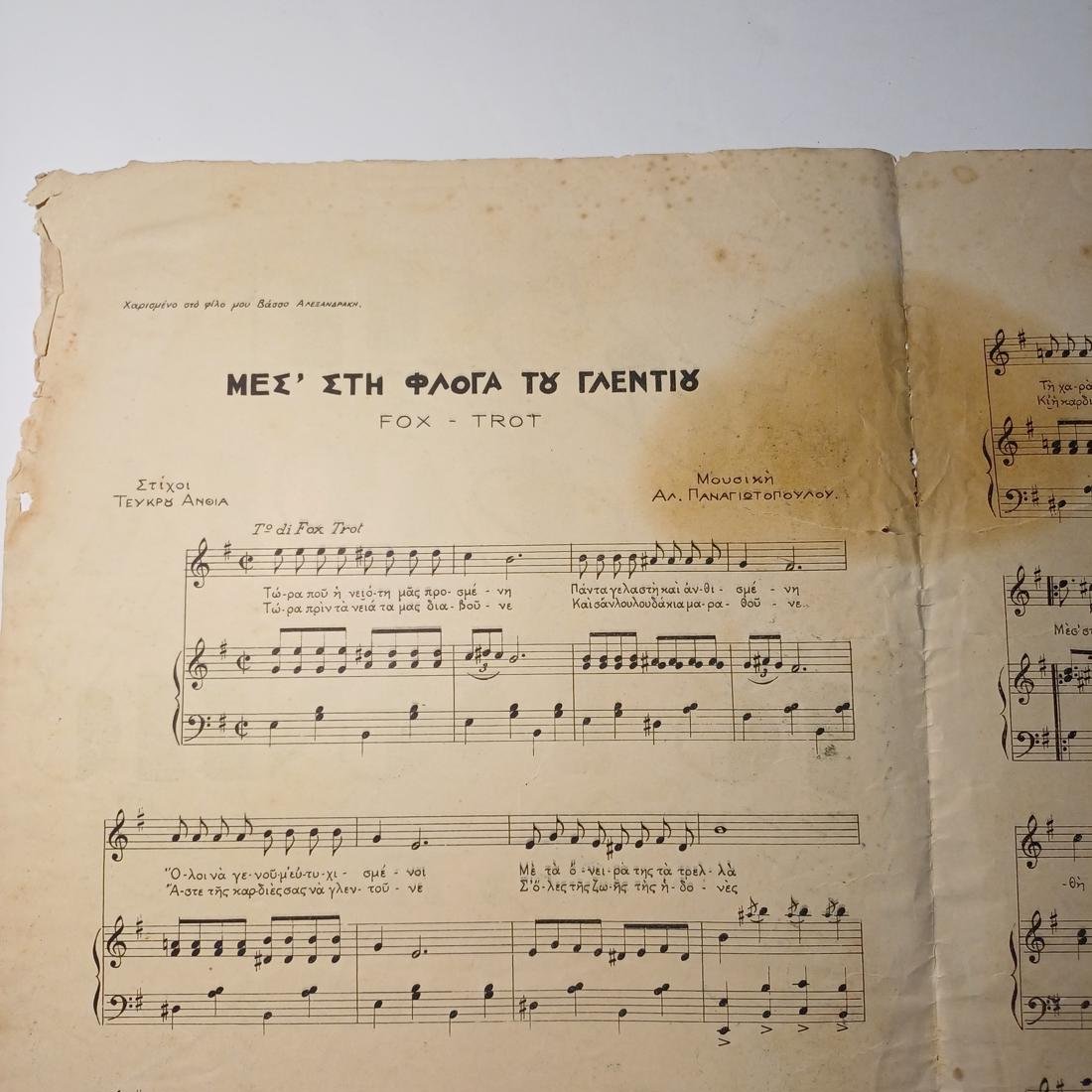 Η σπάνια vintage παρτιτούρα «Μες στη φλόγα του γλεντιού» σε ρυθμό Fox-Trot και μουσική σύνθεση από τον Αλέκο Παναγιωτόπουλο και στίχους από την Τεύκρου Ανθία, σε συνεργασία με τον Ριχ. Φρέτσα. Εκδόθηκε από τους Μουσικούς Οίκους Γαϊτάνου, Κωνσταντινίδου και Σταρρ στην Αθήνα. Οι διαστάσεις είναι 35 x 25 cm και έχει 4 σελίδες.