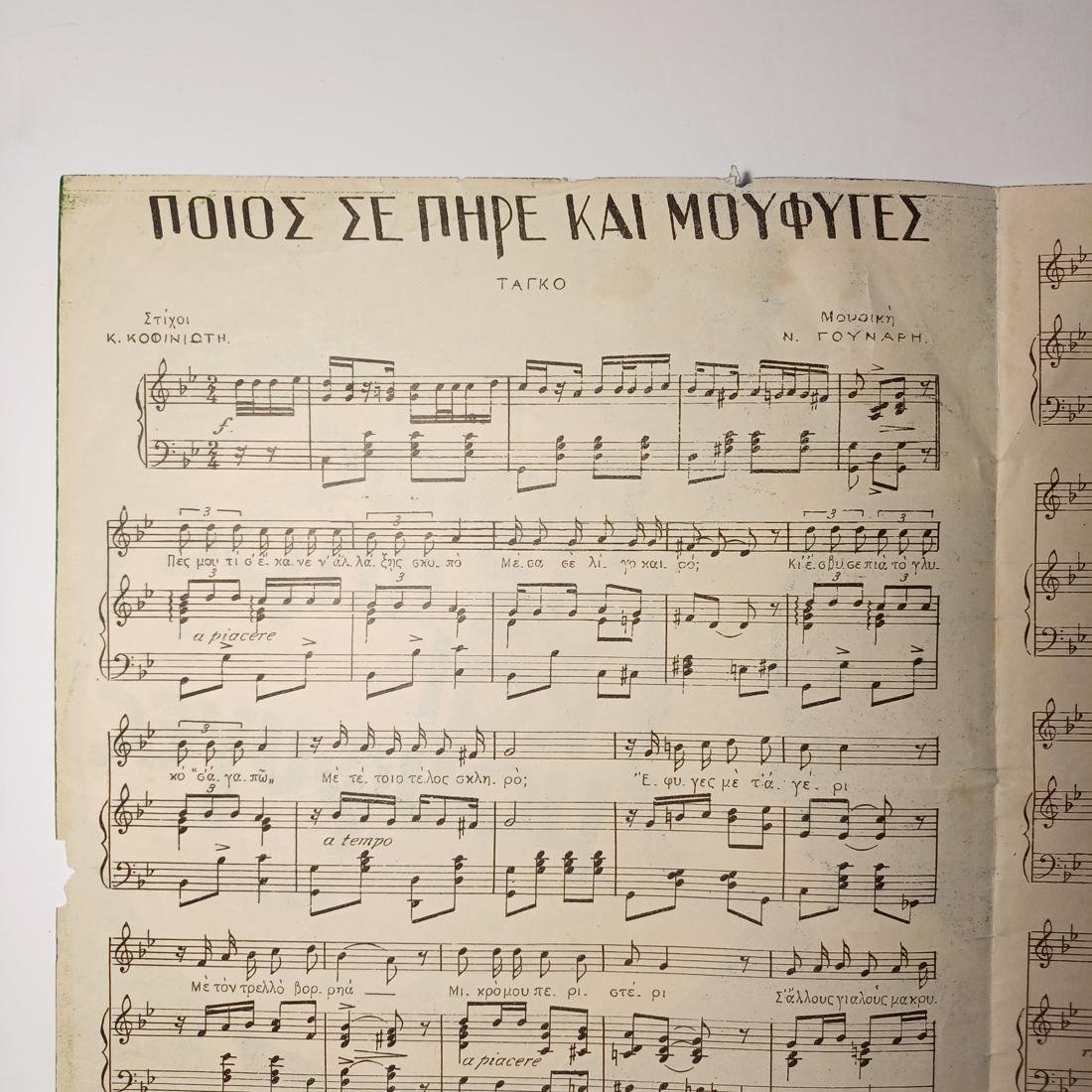 Η σπάνια vintage παρτιτούρα “Ποιός σε πήρε καί μούφυγες” με το δημοφιλές τραγούδι ταγκό, το οποίο κυκλοφόρησε το 1945. Η μουσική είναι του Νίκου Γούναρη και οι στίχοι του Κώστα Κοφινιώτη σε συνεργασία με τον Ριχ. Φρέτσα. Η συγκεκριμένη έκδοση είναι η 4η και εκδόθηκε από τις Εκδόσεις Κωνσταντινίδη στην Αθήνα. Το εξώφυλλο φέρει μια αφιέρωση “ΣΤΟΝ ΕΚΛΕΚΤΟ ΜΟΥ ΦΙΛΟ Γ. ΜΕΡΜΗΓΚΑ Ν.Γ.”. Οι διαστάσεις είναι 31 x 24 cm και έχει 4 σελίδες.
