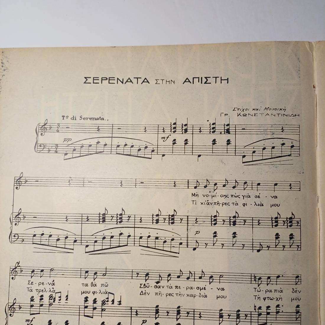 Vintage παρτιτούρα “Σερενάτα στην άπιστη”. Μουσική και στίχοι του Γρηγόρη Κωνσταντινίδη σε συνεργασία με τον Ριχ. Φρέτσα. Εκδόθηκε από τον οίκο Κωνσταντινίδης – Σταρρ στην Αθήνα το 1930. Οι διαστάσεις είναι 33 x 24,5 cm και έχει 4 σελίδες.