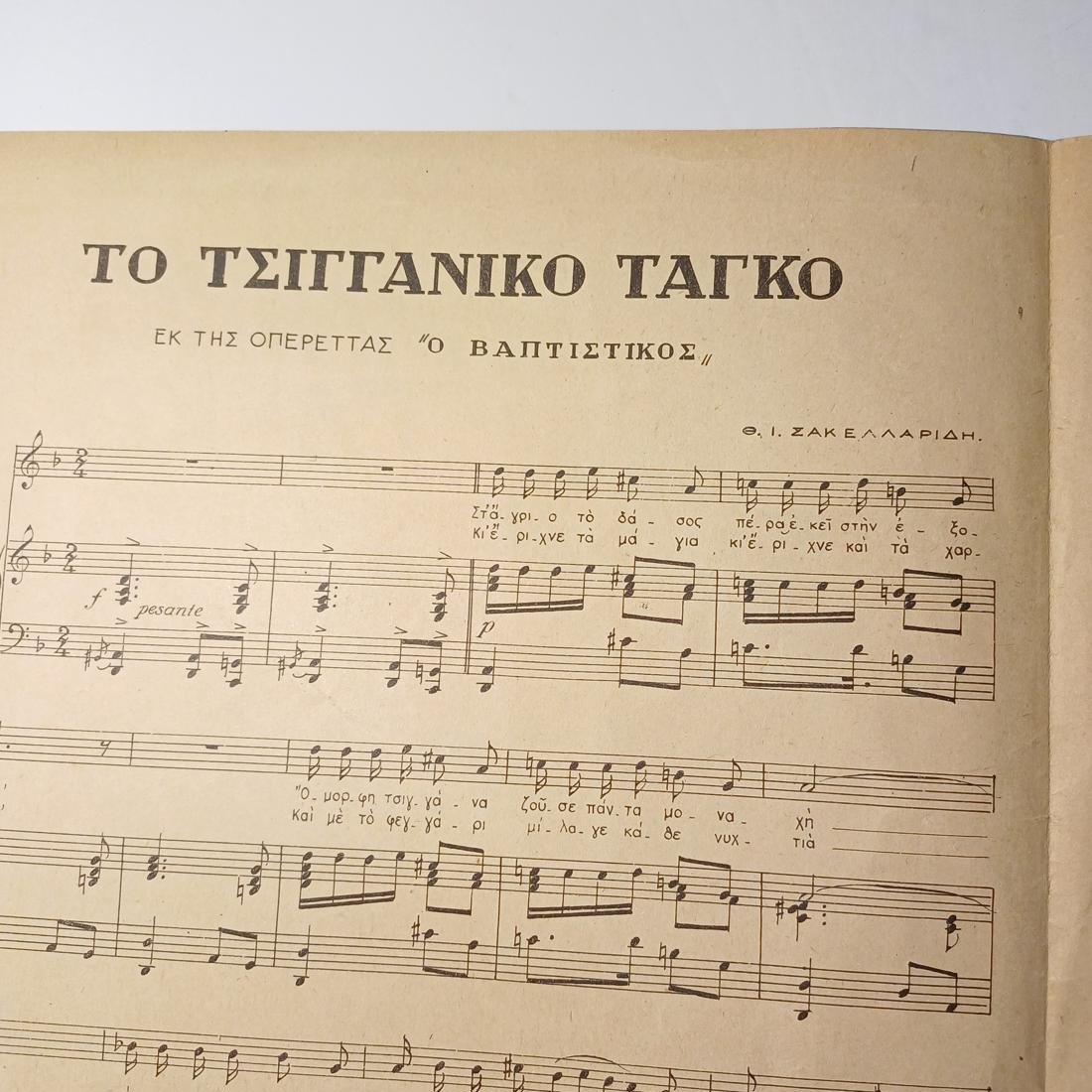 Η σπάνια vintage παρτιτούρα “Το Τσιγγάνικο Τάγκο”, αποτελεί μέρος της διάσημης ελληνικής οπερέτας και μουσική σύνθεση του Θεόφραστου Σακελλαρίδη, “Ο Βαπτιστικός”. Η έκδοση έγινε από τις Εκδόσεις Γαϊτάνου στην Αθήνα το 1930. Οι διαστάσεις είναι 32 x 24 cm και έχει 4 σελίδες.
