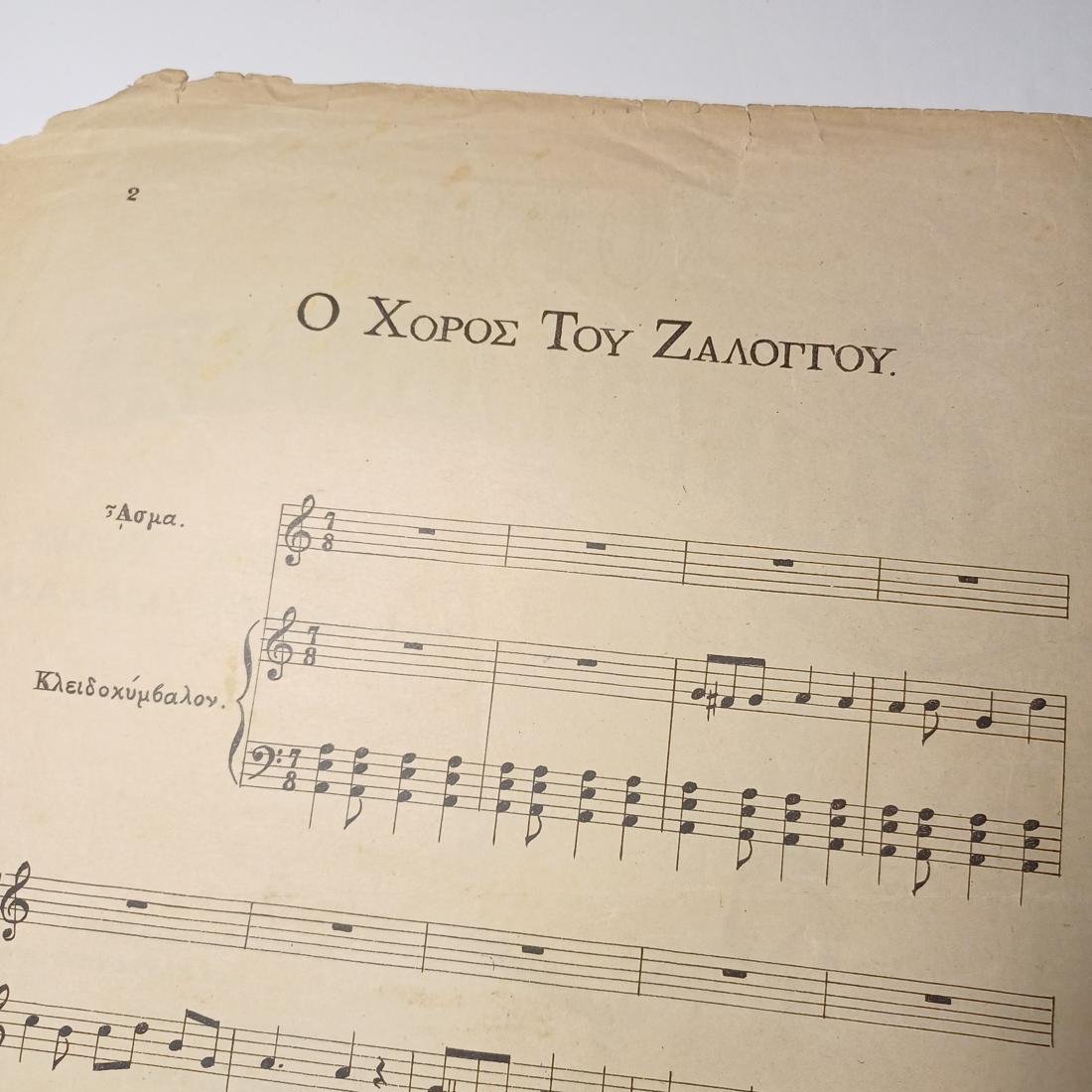 Η σπάνια vintage παρτιτούρα “ΧΟΡΟΙ ΕΛΛΗΝΙΚΟΙ ΔΗΜΩΔΕΙΣ”, εκδόθηκε από τον Μουσικό Οίκο Σ. Γαϊτάνου στην Αθήνα. Η συγκεκριμένη σειρά παρτιτούρων περιλαμβάνει τον χορό “ο Χορός του Ζαλόγγου”. Οι διαστάσεις είναι 34,5 x 25 cm και έχει 4 σελίδες.