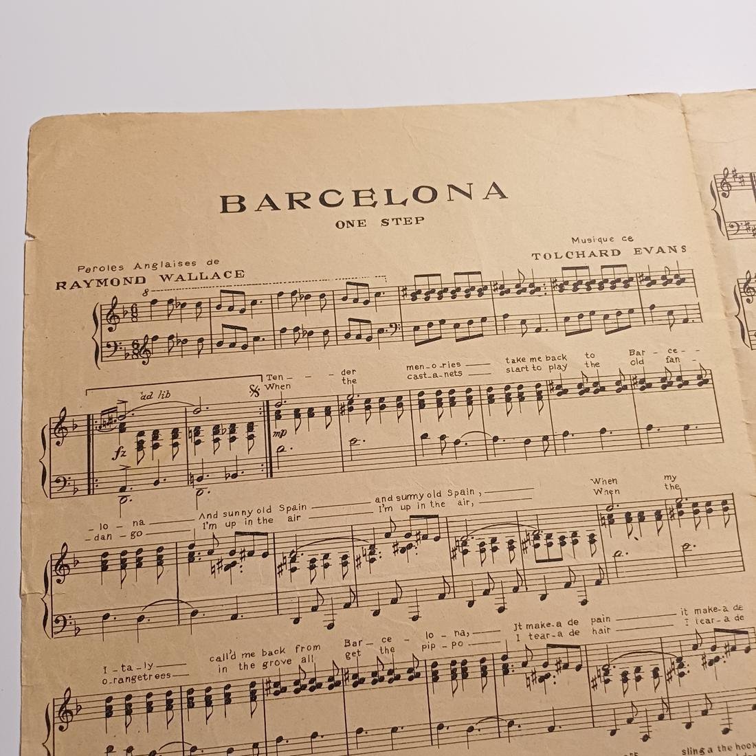Η σπάνια vintage παρτιτούρα “Barcelona (Indigo-Yes!-Indigo)” γνωστή και ως “A Nutty One-Step” είναι σύνθεση του Tolchard Evans, και οι αγγλικοί στίχοι γράφτηκαν από τον Raymond Wallace. Οι διαστάσεις είναι 35 x 25 cm και έχει 4 σελίδες.