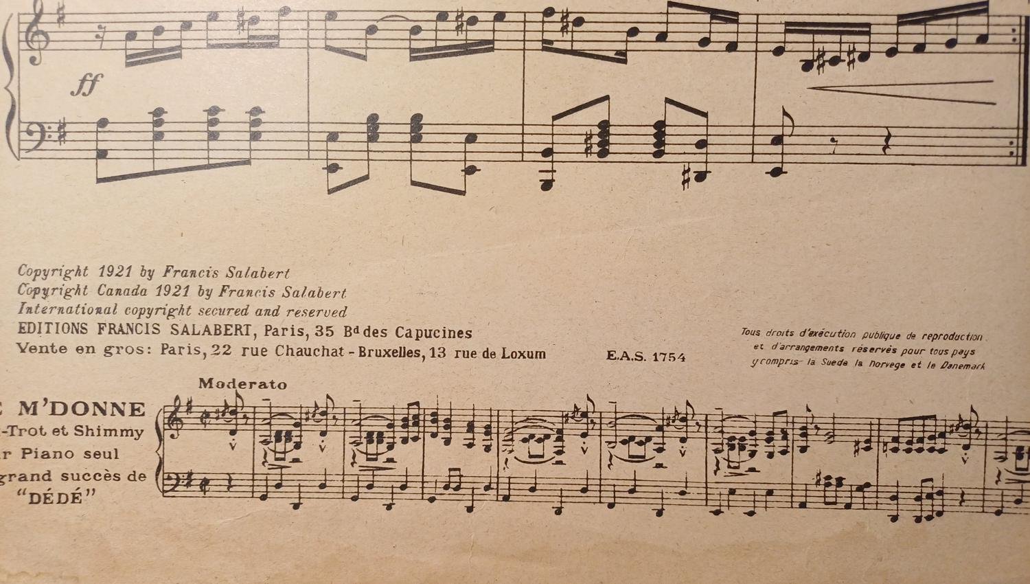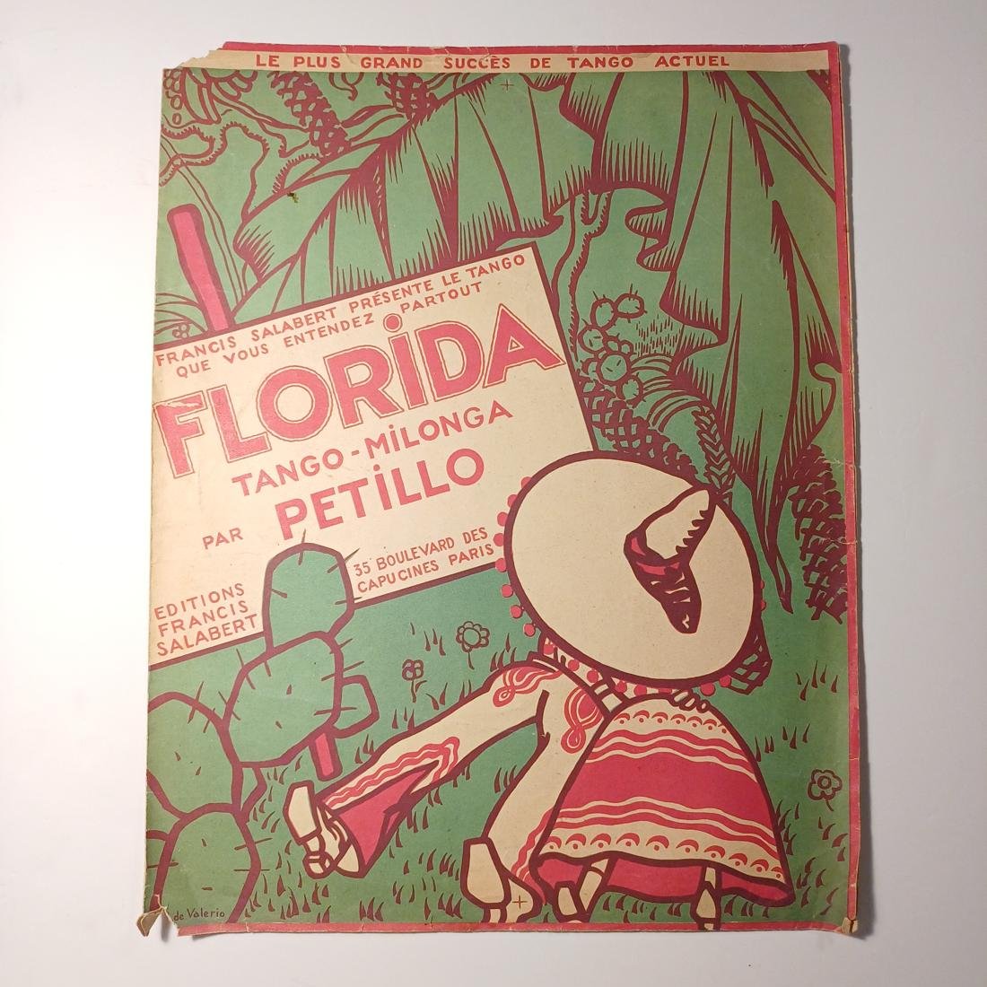 Η σπάνια vintage παρτιτούρα “Florida” γράφτηκε για πιάνο από τον συνθέτη R. Petillo και εκδόθηκε από τις Editions Francis Salabert στο Παρίσι το 1921. Οι διαστάσεις είναι 35 x 27 cm και έχει 4 σελίδες.
