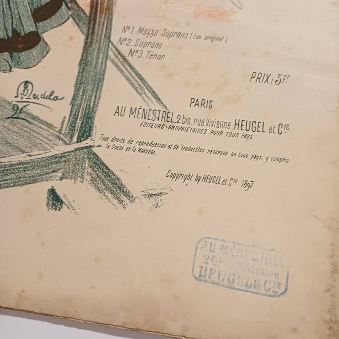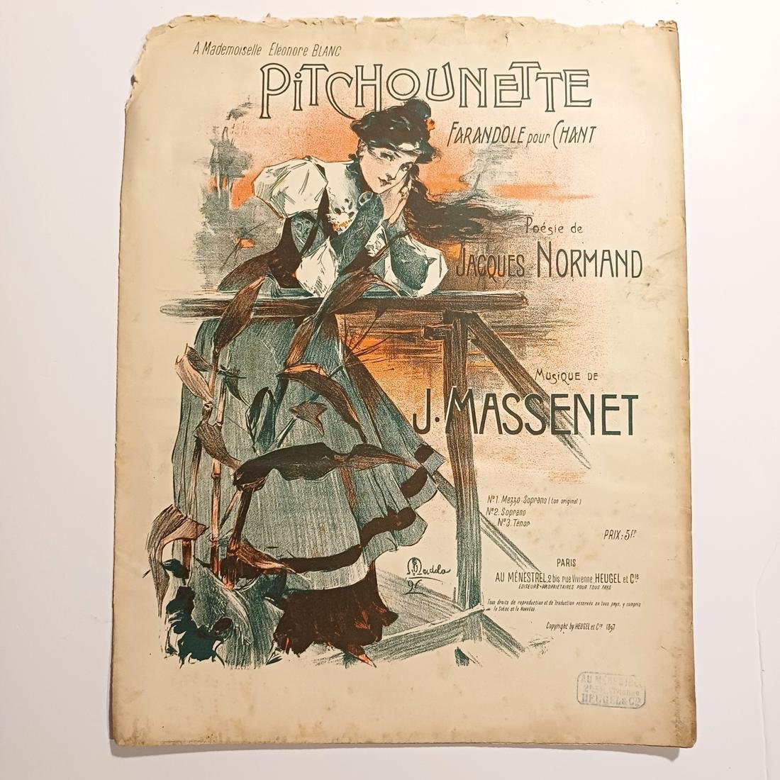 Σπάνια vintage παρτιτούρα με τίτλο “Pitchounette” σε στίχους του Jacques Normand και με τη μουσική σύνθεση να ανήκει στον διάσημο Γάλλο συνθέτη J. Massenet. Το εξώφυλλο είναι μια λιθογραφία, που φέρει την υπογραφή του εικονογράφου “Madola”. Εκδόθηκε από τον οίκο AU MÉNÉSTREL στο Παρίσι το 1897 και είναι αφιερωμένη στη δεσποινίδα Éléonore Blanc. Οι διαστάσεις της είναι 35*27 cm και αποτελείται από 8 σελίδες.