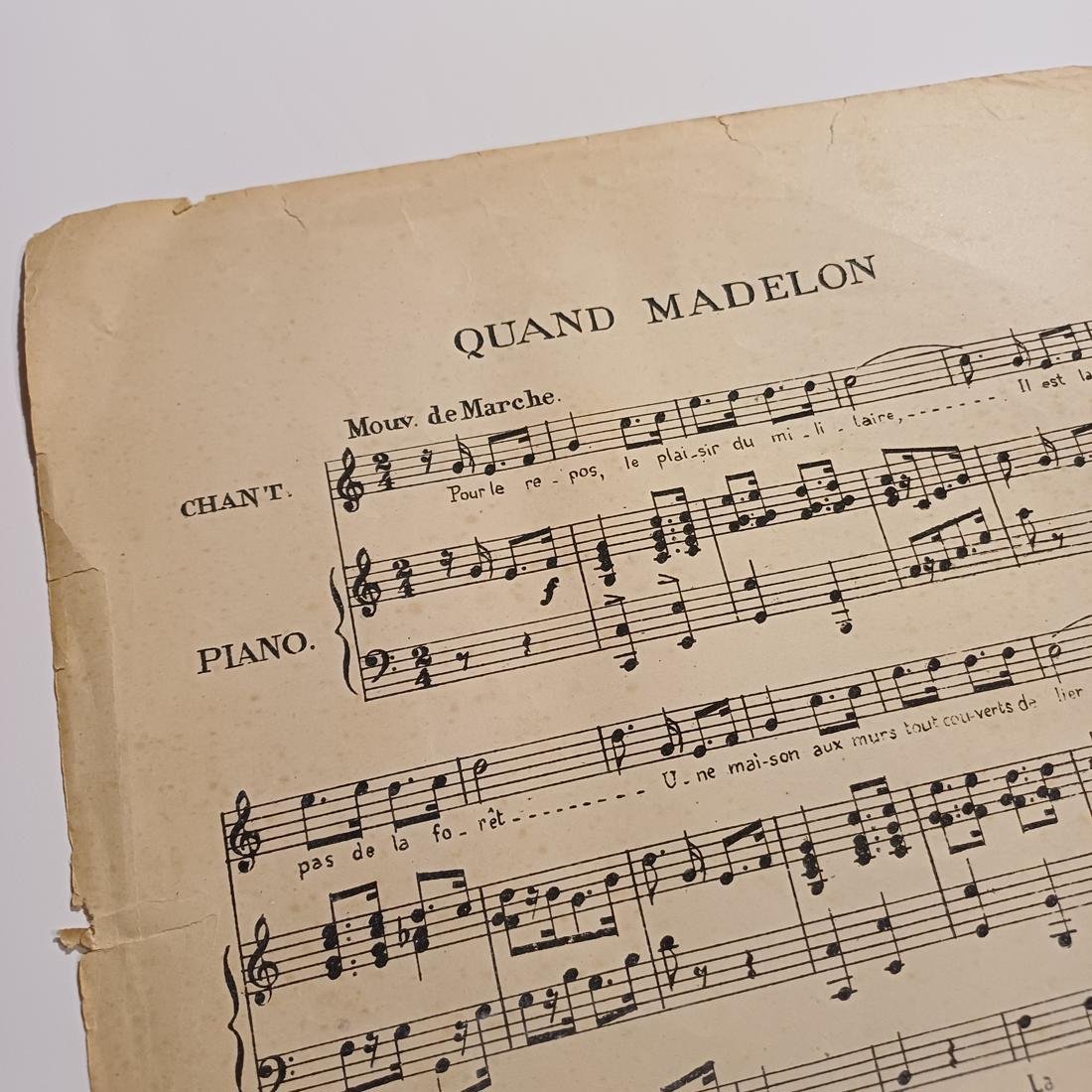 Σπάνια vintage παρτιτούρα του γαλλικού στρατιωτικού τραγουδιού του Α’ Παγκοσμίου Πολέμου, “Quand Madelon”. Οι στίχοι γράφτηκαν από τον L. Bousquet και η μουσική συντέθηκε από τον Camille Robert. Οι πρώτοι ερμηνευτές του ήταν ο Polin και ο Bach. Το συγκεκριμένο αντίτυπο εκδόθηκε από τον S. Christidis στην Κωνσταντινούπολη. Οι διαστάσεις είναι 34 x 25 cm και έχει 4 σελίδες.