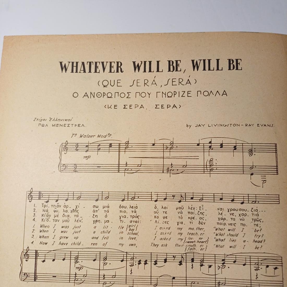 Η σπάνια vintage παρτιτούρα “Que Sera, Sera (Whatever Will Be, Will Be)”, όπως παρουσιάστηκε στην ταινία του Άλφρεντ Χίτσκοκ, Ο Άνθρωπος που Γνώριζε Πολλά (The Man Who Knew Too Much) του 1956. Το τραγούδι, με τίτλο στα ελληνικά “Θα γίνη ό,τι είναι γραφτό”, με ελληνικούς στίχους από τον Πωλ Μενεστρέλ, γράφτηκε από τους Jay Livingston και Ray Evans και ερμηνεύτηκε αρχικά από την Doris Day στην ταινία. Η συγκεκριμένη παρτιτούρα είναι μια vintage έκδοση του 1955, με ελληνικό κείμενο και πληροφορίες από την εταιρεία Melcher-Toff Music Co. Ltd. Οι διαστάσεις είναι 31,5 x 24 cm και έχει 4 σελίδες.