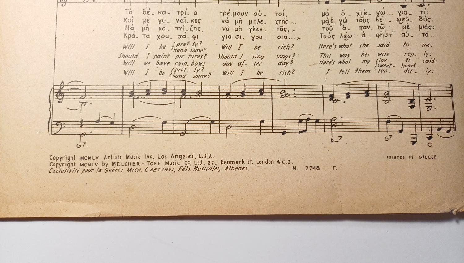 Vintage παρτιτούρα “Que Sera, Sera-Whatever Will Be, Will Be” Jay Livingston (1955).