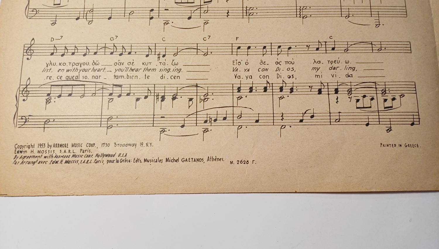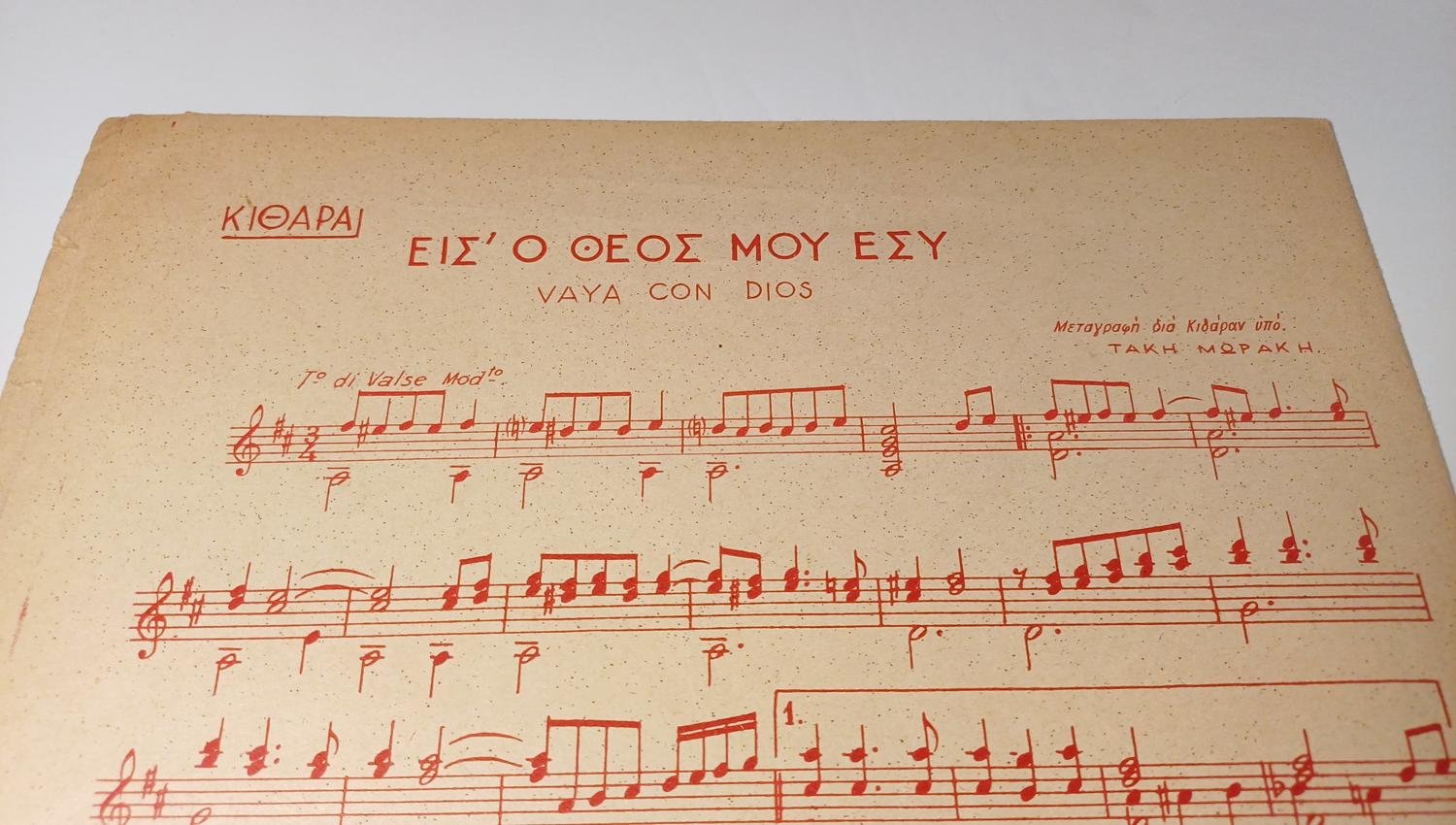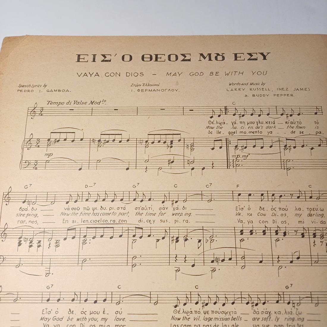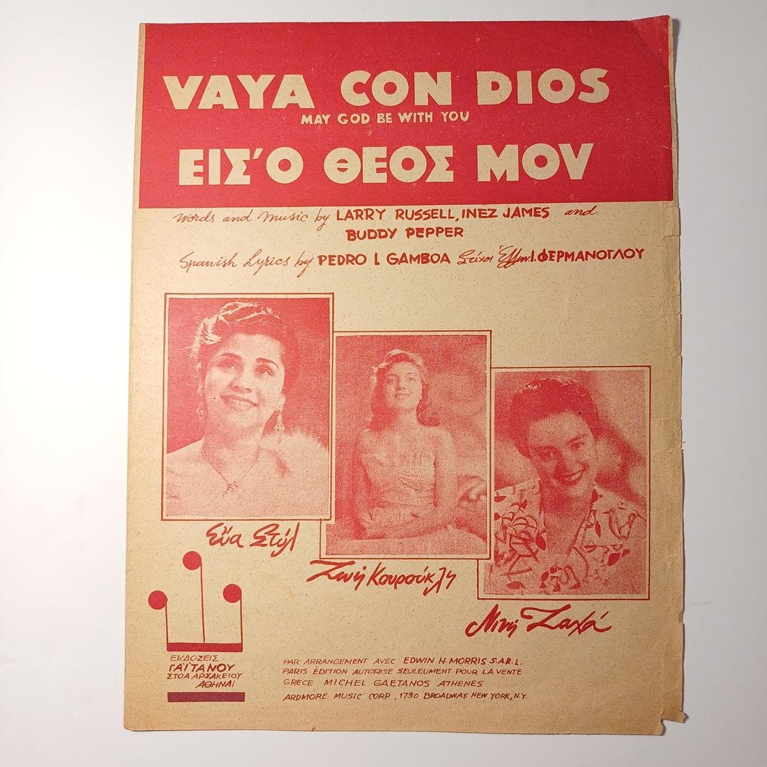 Σπάνια vintage παρτιτούρα “Vaya Con Dios (Είσ΄ο θεός μου)”. Η μουσική και οι στίχοι είναι γραμμένοι από τους Larry Russell, Inez James και Buddy Pepper, περιλαμβάνει επίσης ισπανικούς στίχους από τον Pedro I Gamboa και ελληνικούς στίχους από τον Ι. Φερμάνογλου. Επίσης περιλαμβάνει μια παρτιτούρα για φωνή και πιάνο και μια παρτιτούρα για κιθάρα. Η συγκεκριμένη έκδοση τυπώθηκε από τις Εκδόσεις Γαϊτάνου στην Αθήνα το 1953 και διαθέτει φωτογραφίες τριών Ελληνίδων ερμηνευτριών: της Εύας Στυλ, της Ζωής Κουρούκλη, και της Νίνης Ζαχά. Οι διαστάσεις είναι 31,5 x 24 cm και έχει 4 σελίδες.