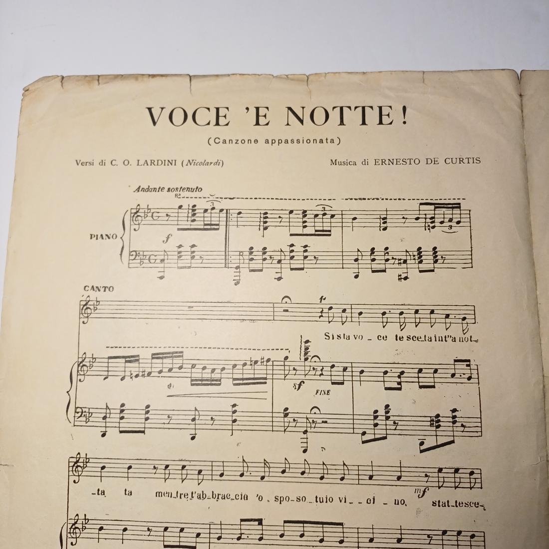Η vintage παρτιτούρα “Voce ‘e notte!” είναι ένα ναπολιτάνικο τραγούδι  (Canzone appassionata), που συντέθηκε από τον Ernesto De Curtis με στίχους του C. O. Lardini (ψευδώνυμο Nicolardi), και δημοσιεύτηκε από τον εκδοτικό οίκο Premiato Stabilimento F. Bideri στη Νάπολη, με αριθμό 217. Το εξώφυλλο της παρτιτούρας είναι έργο του Ιταλού ζωγράφου και εικονογράφου Pietro Scoppetta. Οι διαστάσεις είναι 34,5 x 24,5 cm και έχει 4 σελίδες.