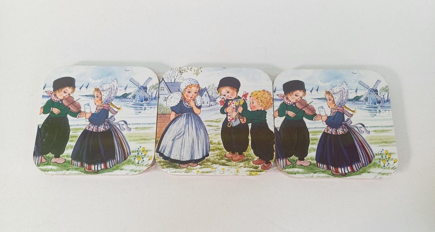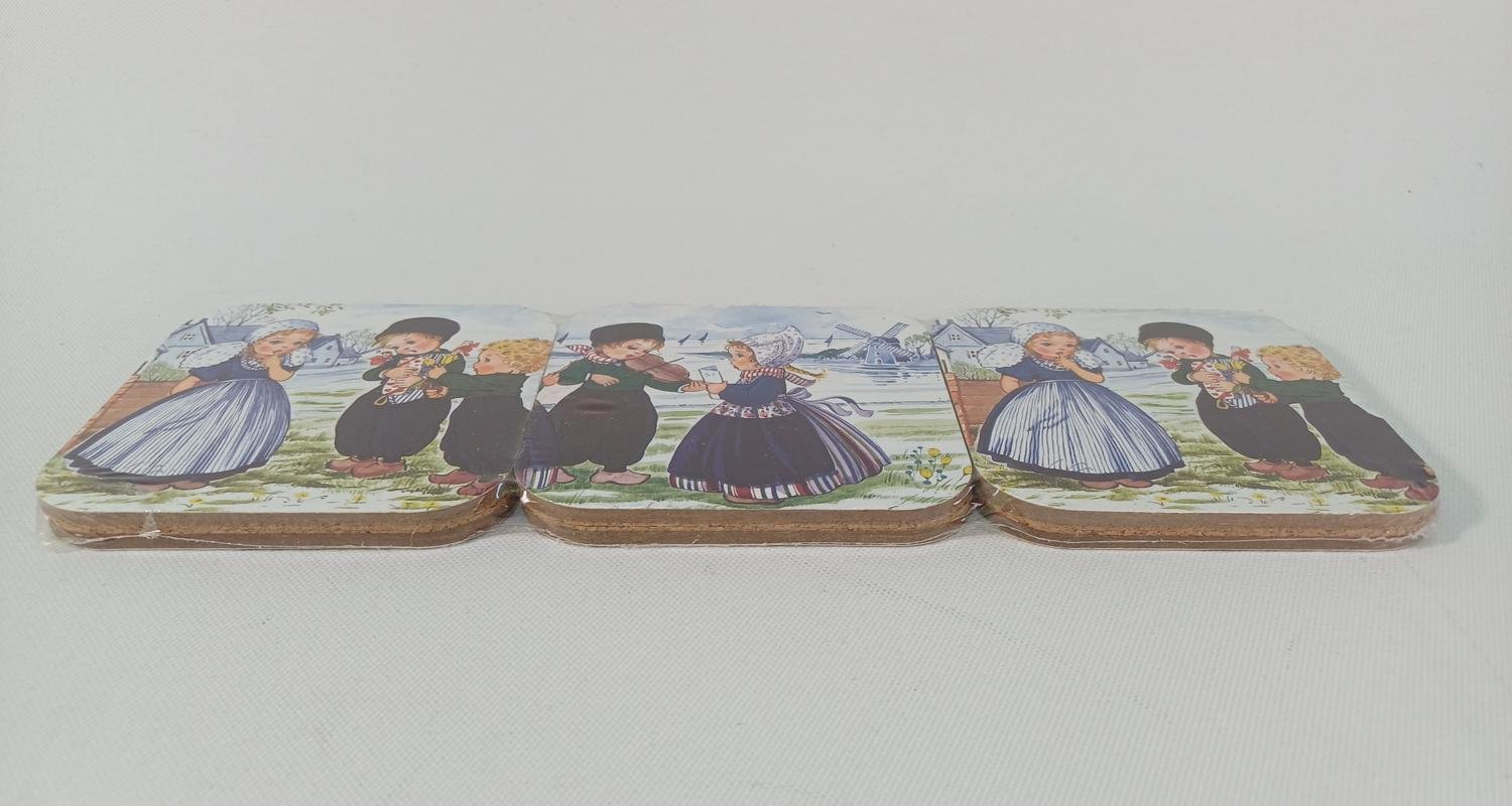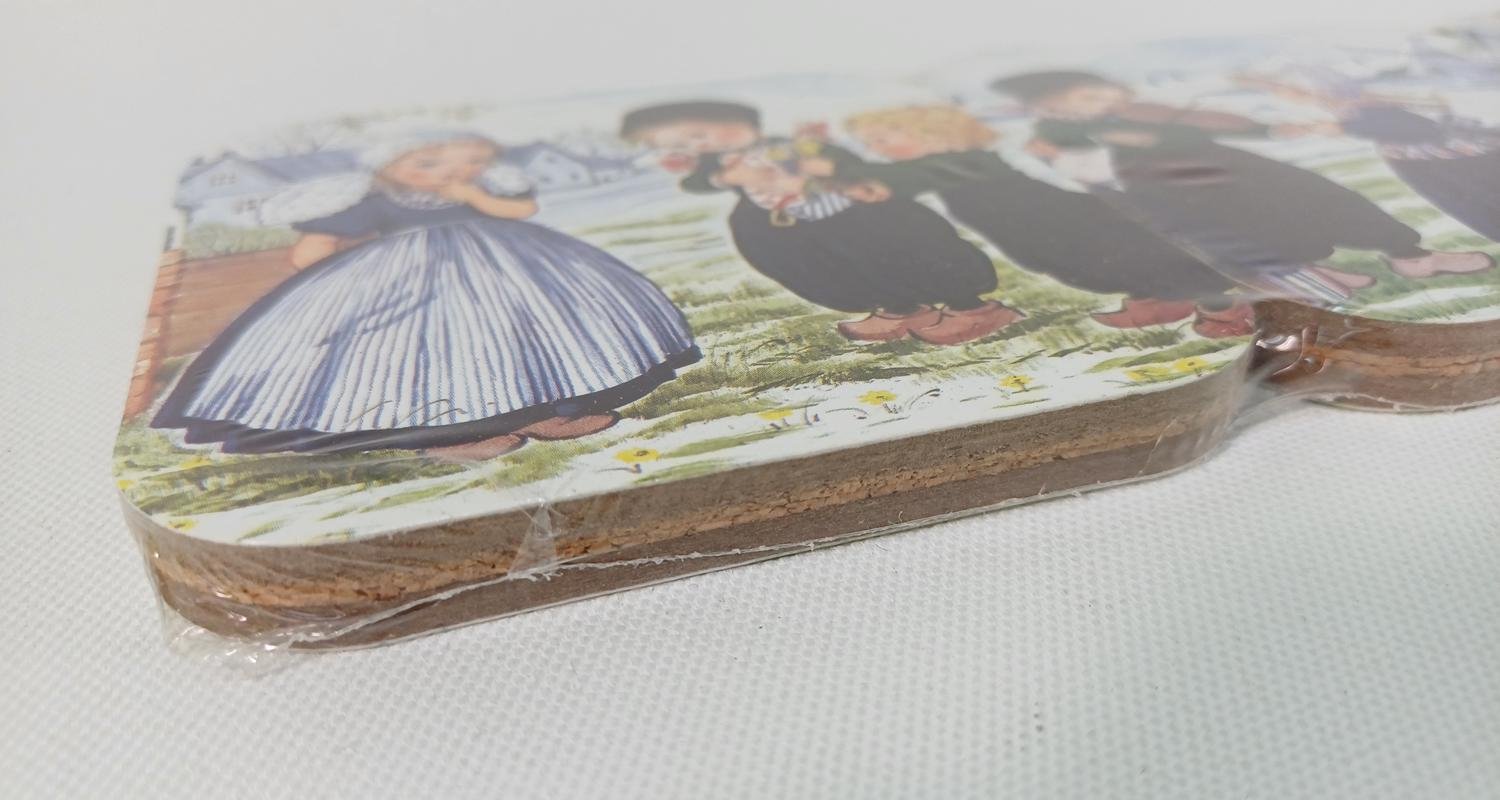 6 vintage σουβέρ φελλού τα οποία απεικονίζουν παιδιά στην Ολλανδική εξοχή με παραδοσιακές φορεσιές σε 2 σχέδια (στην αρχική τους συσκευασία)