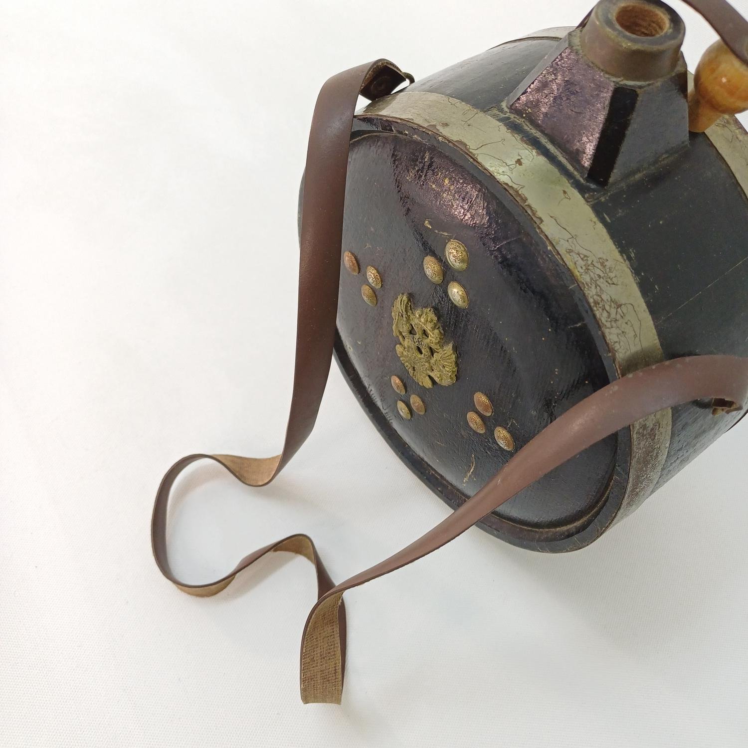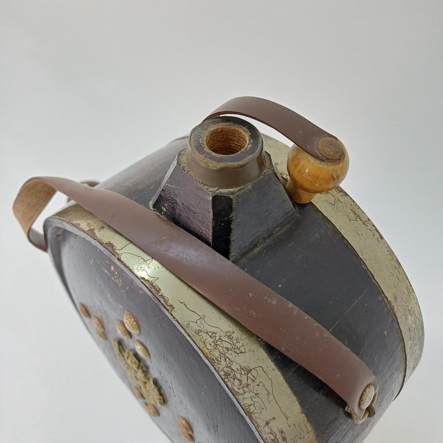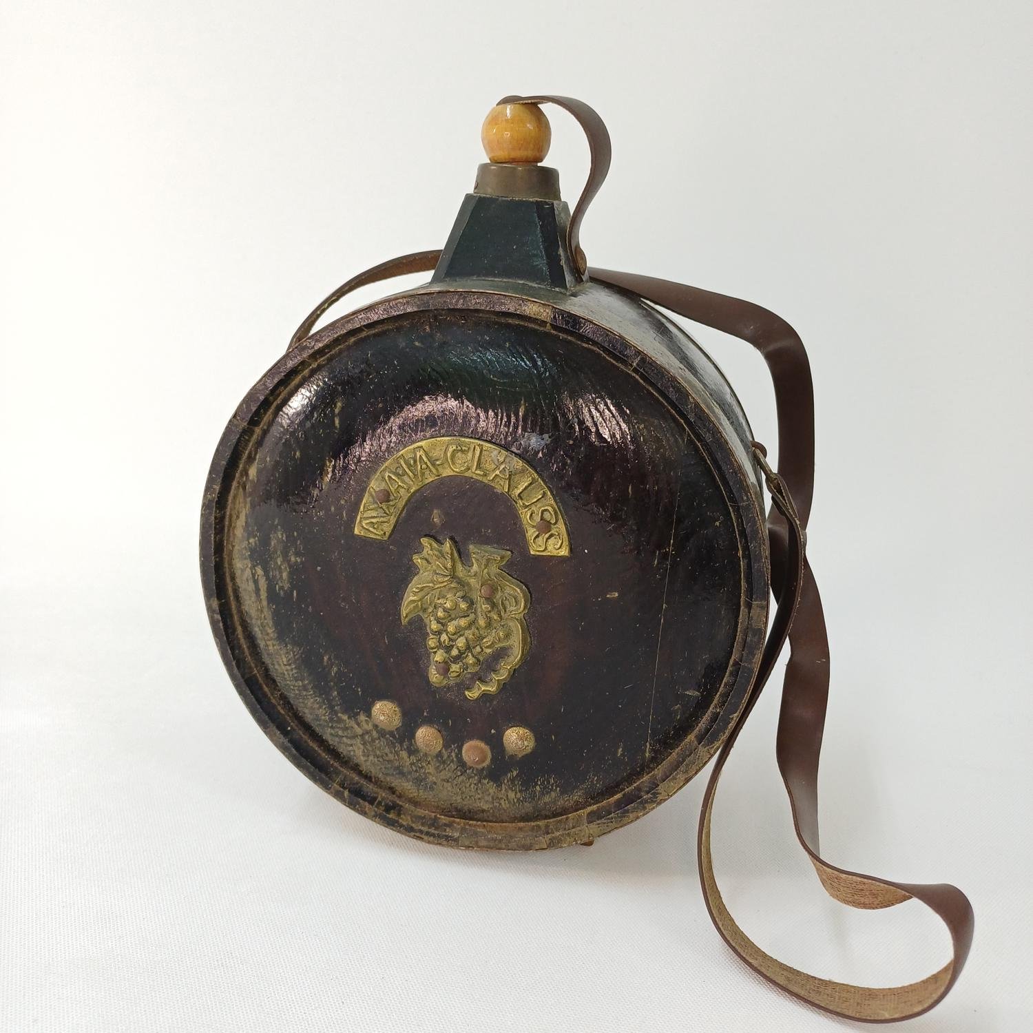 Vintage συλλεκτικό διακοσμητικό φλασκί από ξύλο με μεταλλικά και δερμάτινα στοιχεία με την επωνυμία “Axaia Clauss” το οποίο χρονολογείται στις αρχές του 20ού αιώνα.