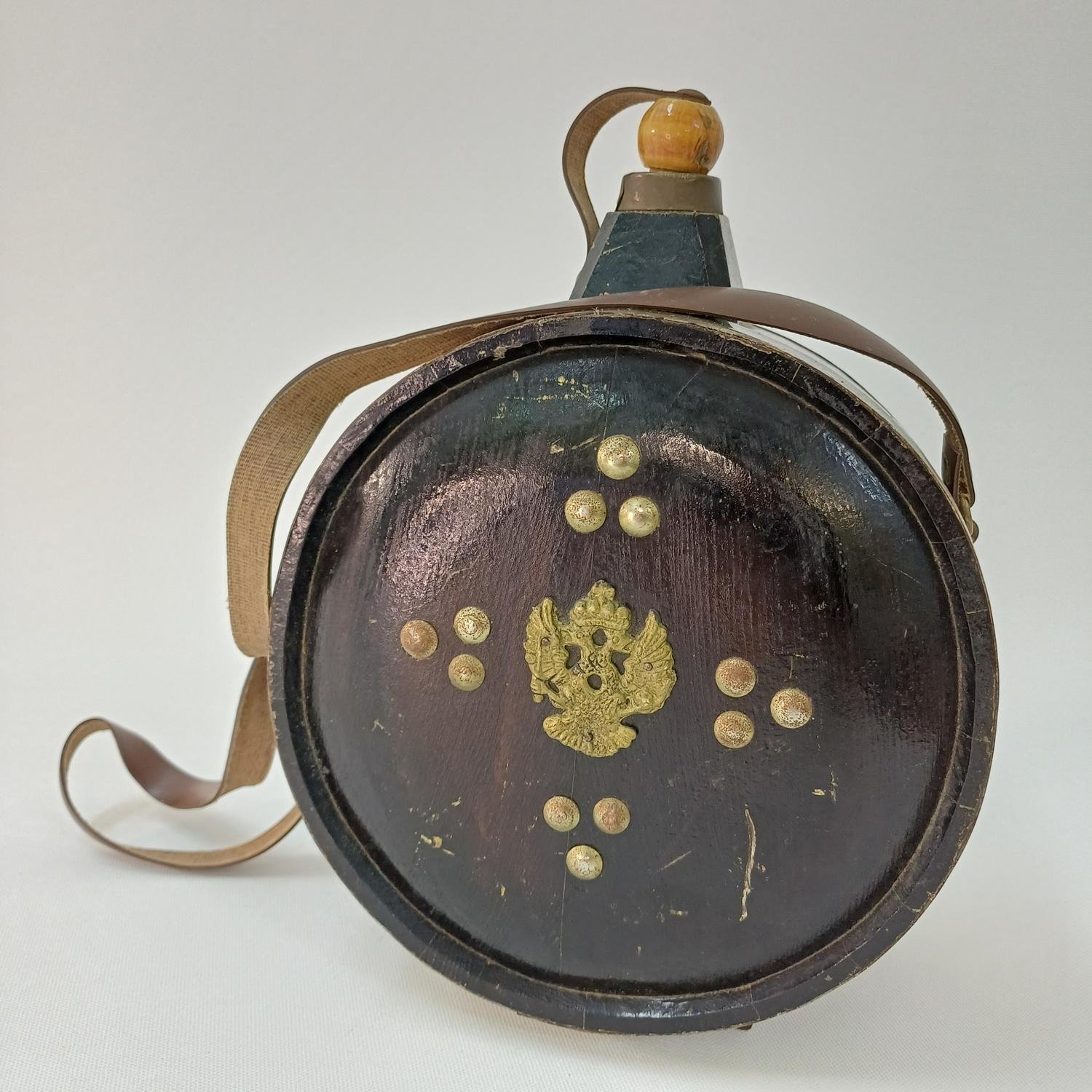 Σπάνιο συλλεκτικό φλασκί “Αχάια Clauss” από ξύλο με μεταλλικά και δερμάτινα στοιχεία