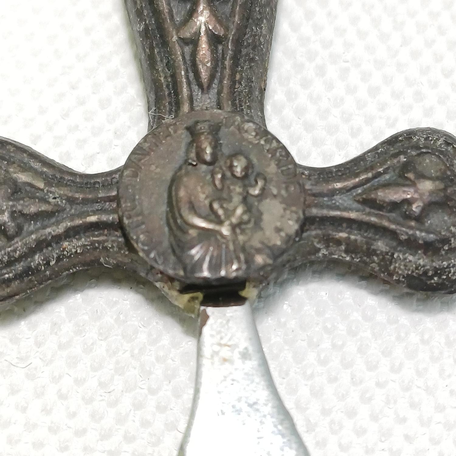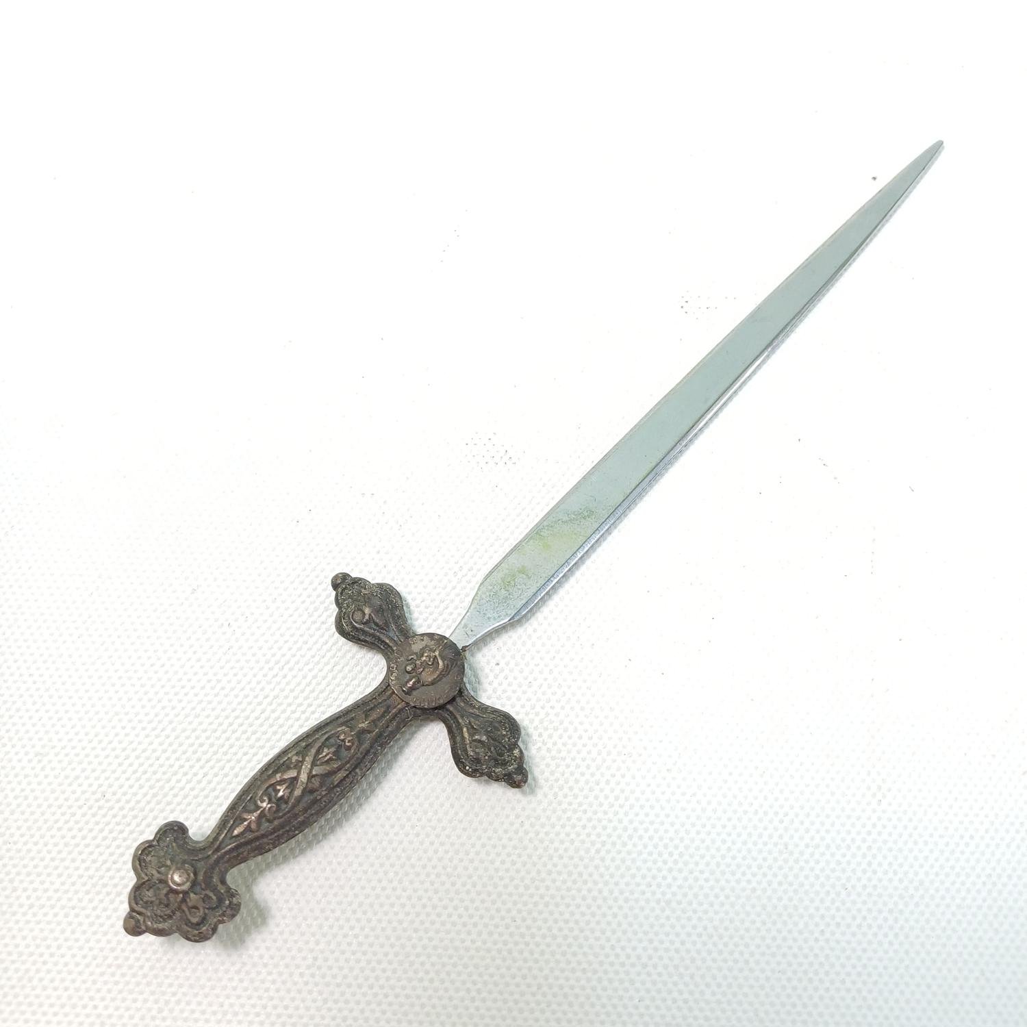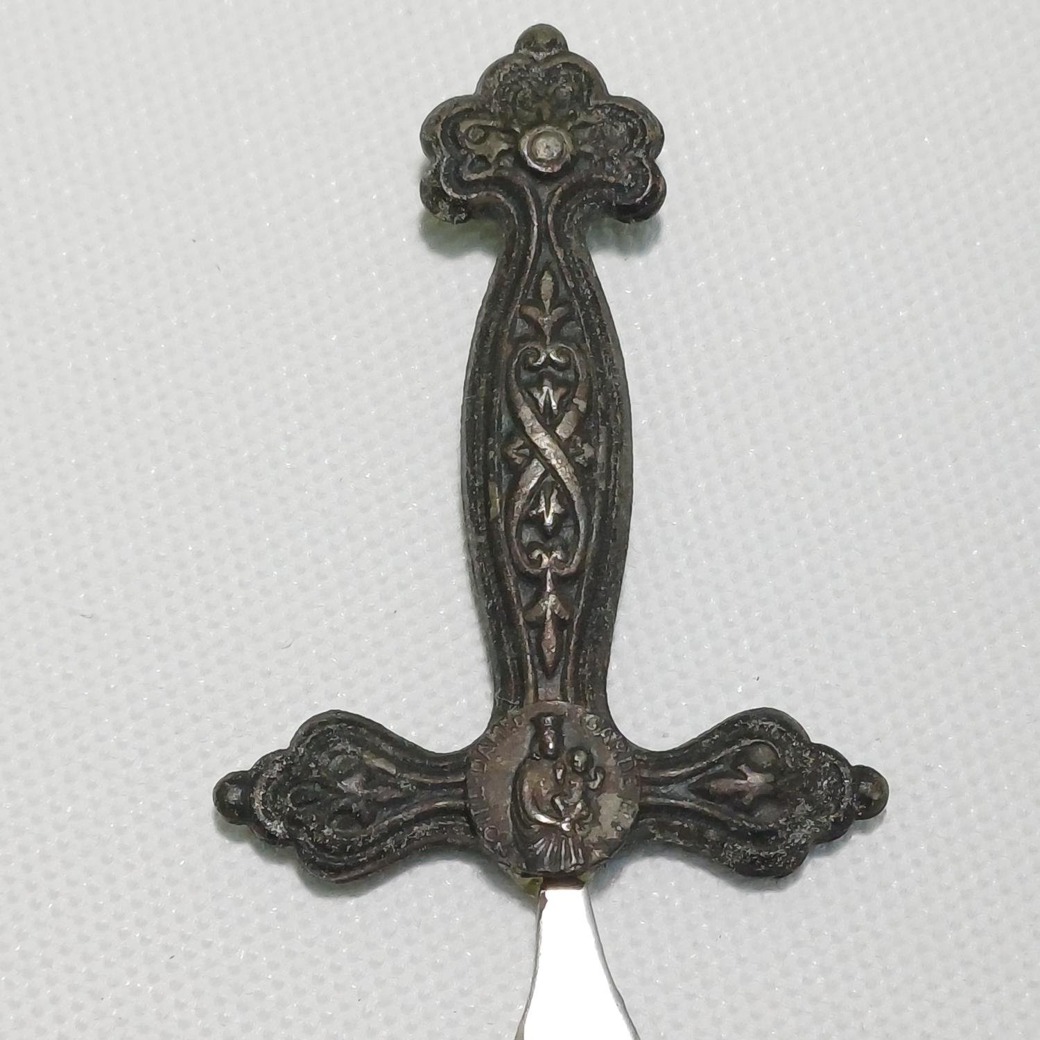 Μικρός vintage μεταλλικός χαρτοκόπτης (letter opener). Στην περίτεχνα σκαλισμένη λαβή του υπάρχει η απεικόνιση της Παναγίας των Παρισίων κρατώντας τον Ιησού και αναγράφει περιμετρικά τις λέξεις: “NOTRE DAME GARDE …..”