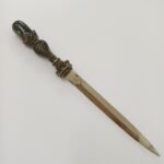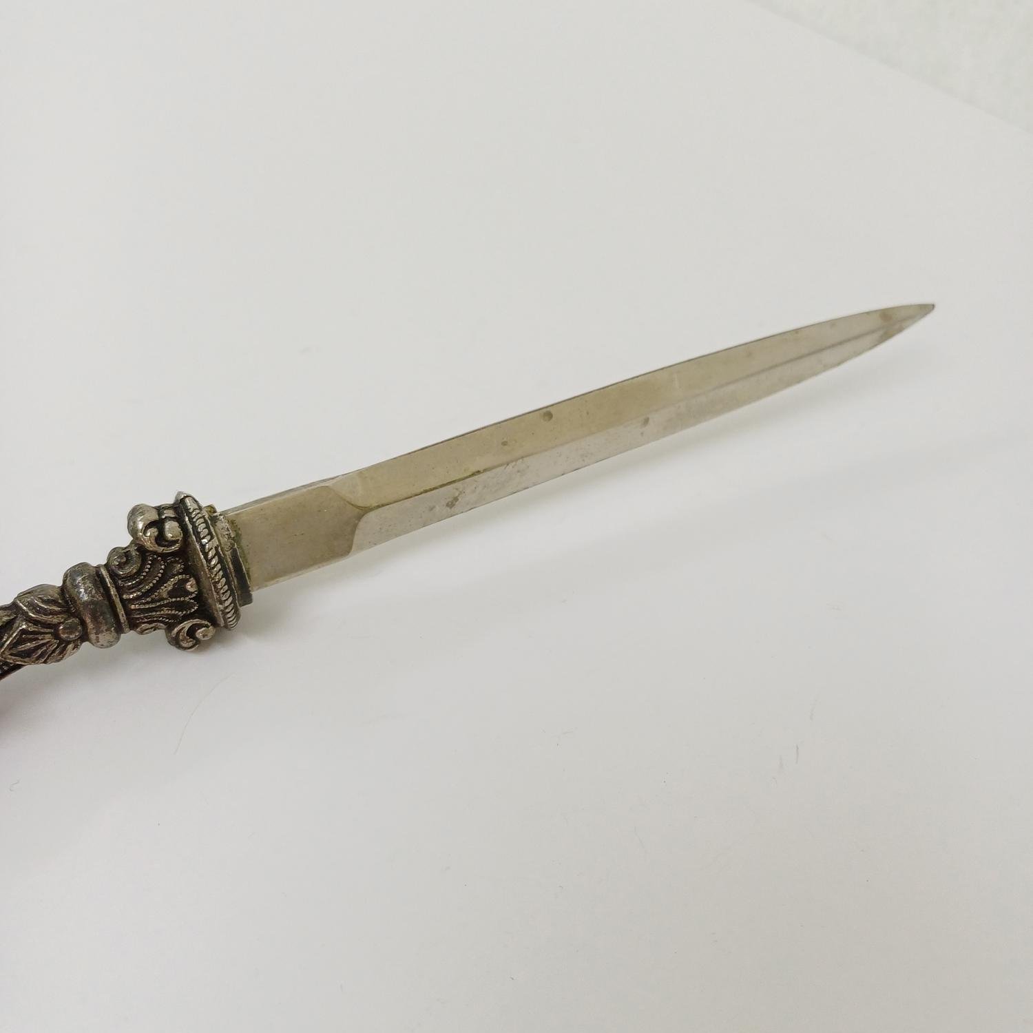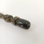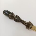 Vintage χαρτοκόπτης με περίτεχνο σχέδιο λαβής από αλπακά και ιδιαίτερο τελείωμα πέτρας σε γκρι αποχρώσεις. Έχει μήκος 22 cm και υπάρχει φθορά στην επιφάνεια του μετάλλου λόγω παλαιότητας.