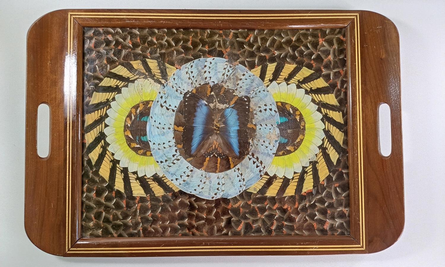 Αυτό το είδος έργου τέχνης είναι μια παραδοσιακή τέχνη από τη Βραζιλία και απαιτούσε μεγάλη δεξιοτεχνία για να δημιουργηθεί. Οι πεταλούδες Morpho προέρχονται από τη Νότια Αμερική, συμπεριλαμβανομένης της Βραζιλίας, και τα φτερά τους έχουν χρησιμοποιηθεί από ντόπιους τεχνίτες εδώ και αιώνες για να δημιουργήσουν πραγματικά μοναδικά κομμάτια. Η σπανιότητα αυτών των πεταλούδων όσο και η δυσκολία για να δημιουργηθεί ένα τέτοιο αντικείμενο, το καθιστά ένα μοναδικό κομμάτι. Οι βραζιλιάνικοι ξύλινοι δίσκοι με ένθετα αληθινά φτερά πεταλούδας Morpho μπορούν να χρησιμοποιηθούν τόσο ως λειτουργικά αντικείμενα όσο και ως διακοσμητικά έργα τέχνης και χρονολογούνται γύρω στα 1940.