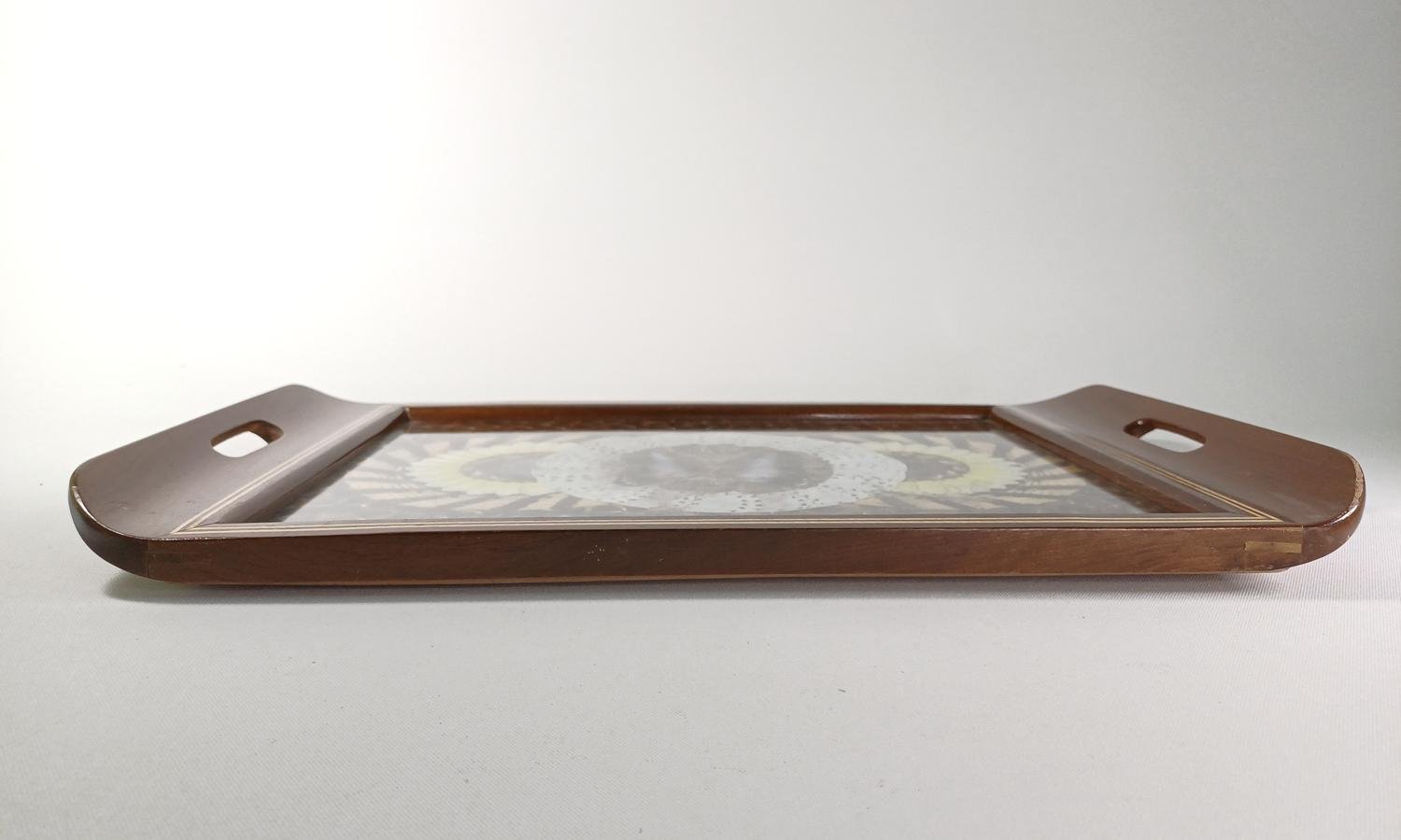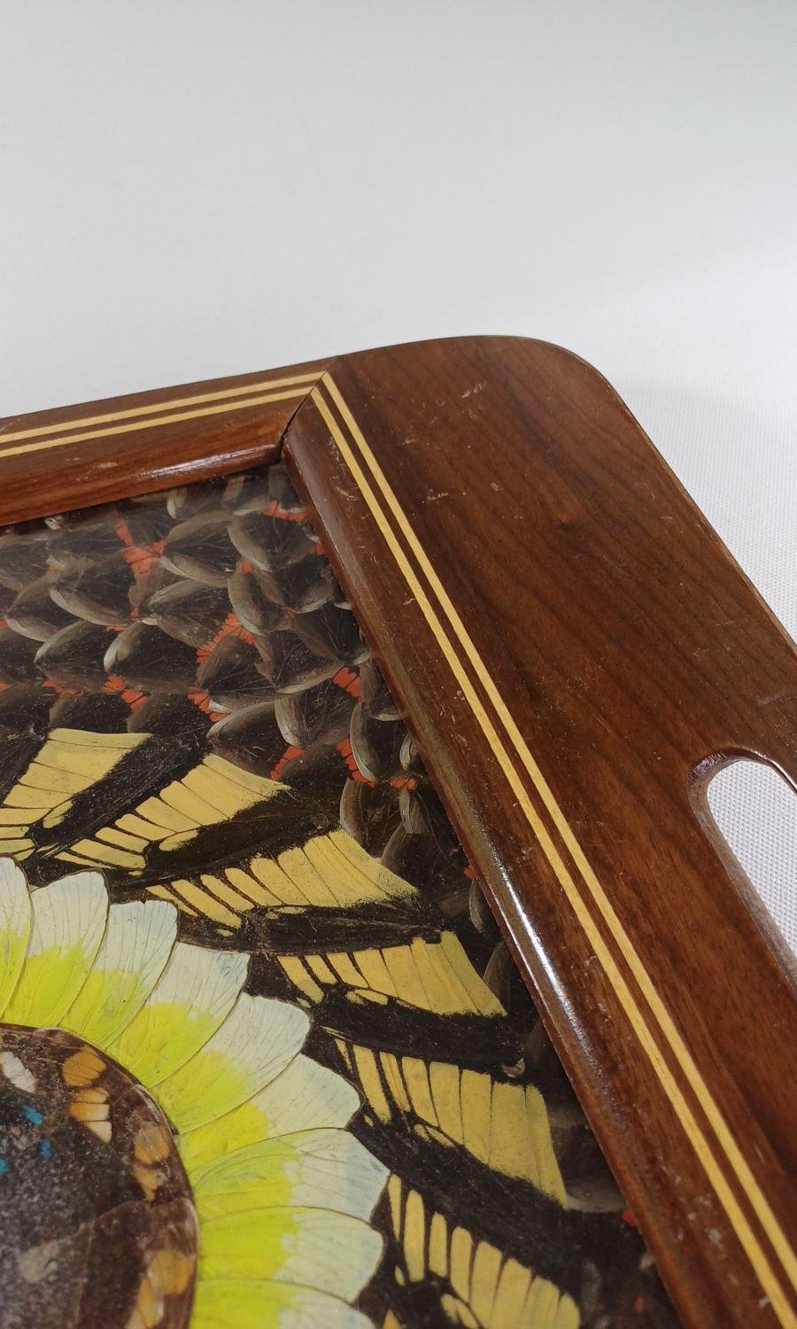 Vintage βραζιλιάνικος δίσκος από ξύλο μαόνι με ένθετη μαρκετερί και γεωμετρικά σχέδια φτιαγμένα από αληθινά φτερά της λαμπερής ιριδίζουσας μπλε πεταλούδας Morpho