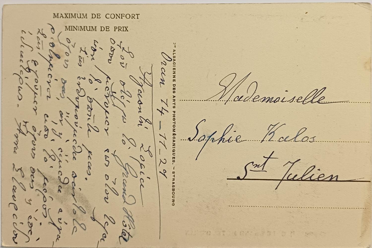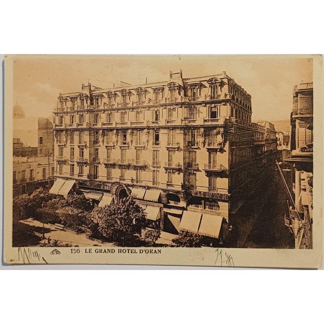 Η vintage καρτ ποστάλ απεικονίζει το Le Grand Hotel d’Oran (Μεγάλο Ξενοδοχείο του Οράν) στην Αλγερία. (μπροστινή όψη). Αναγράφεται προσωπική σημείωση (χρονολ. 1929). (πίσω όψη)
