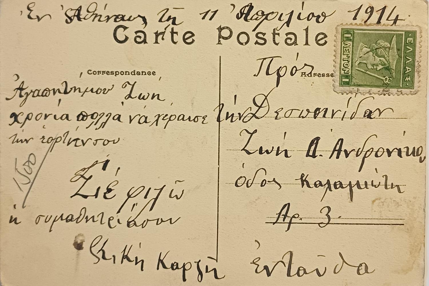 Αναγράφεται προσωπική σημείωση μαζί με ένα γραμματόσημο του ενός λεπτού (χρονολογία αποστολής 1914). (πίσω όψη)