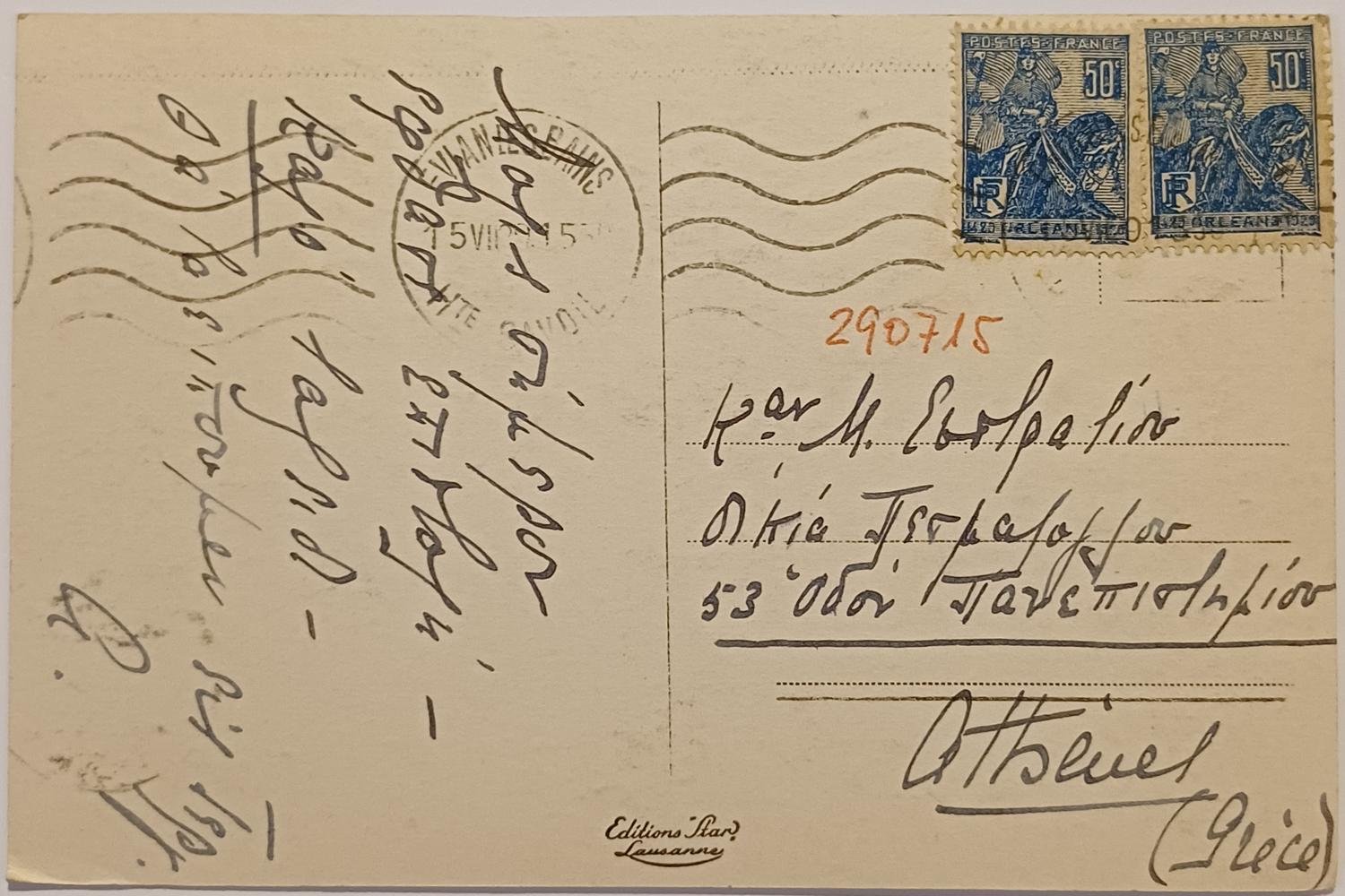 Αναγράφεται προσωπική σημείωση μαζί με τρεις σφραγίδες και δύο γραμματόσημα. (πίσω όψη)
