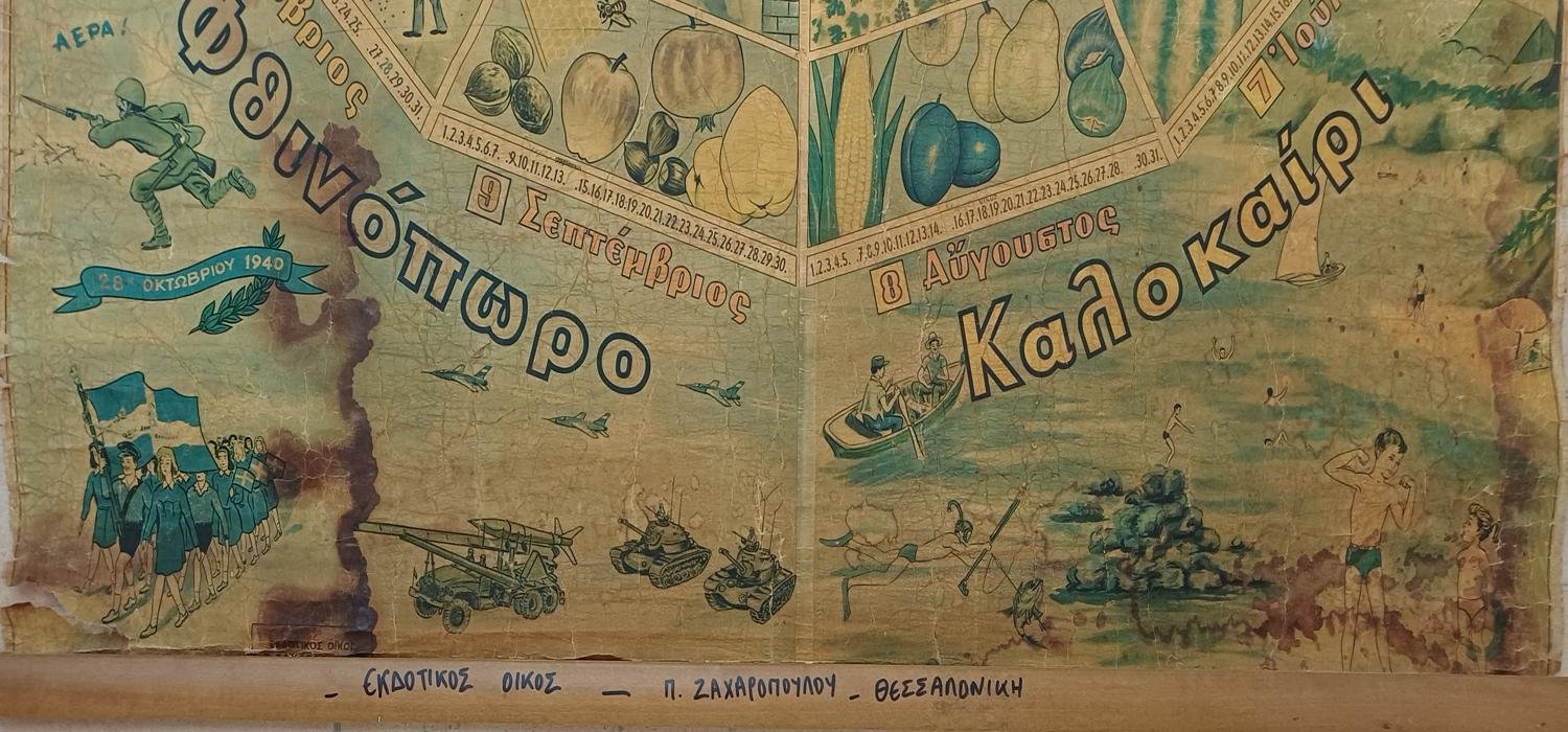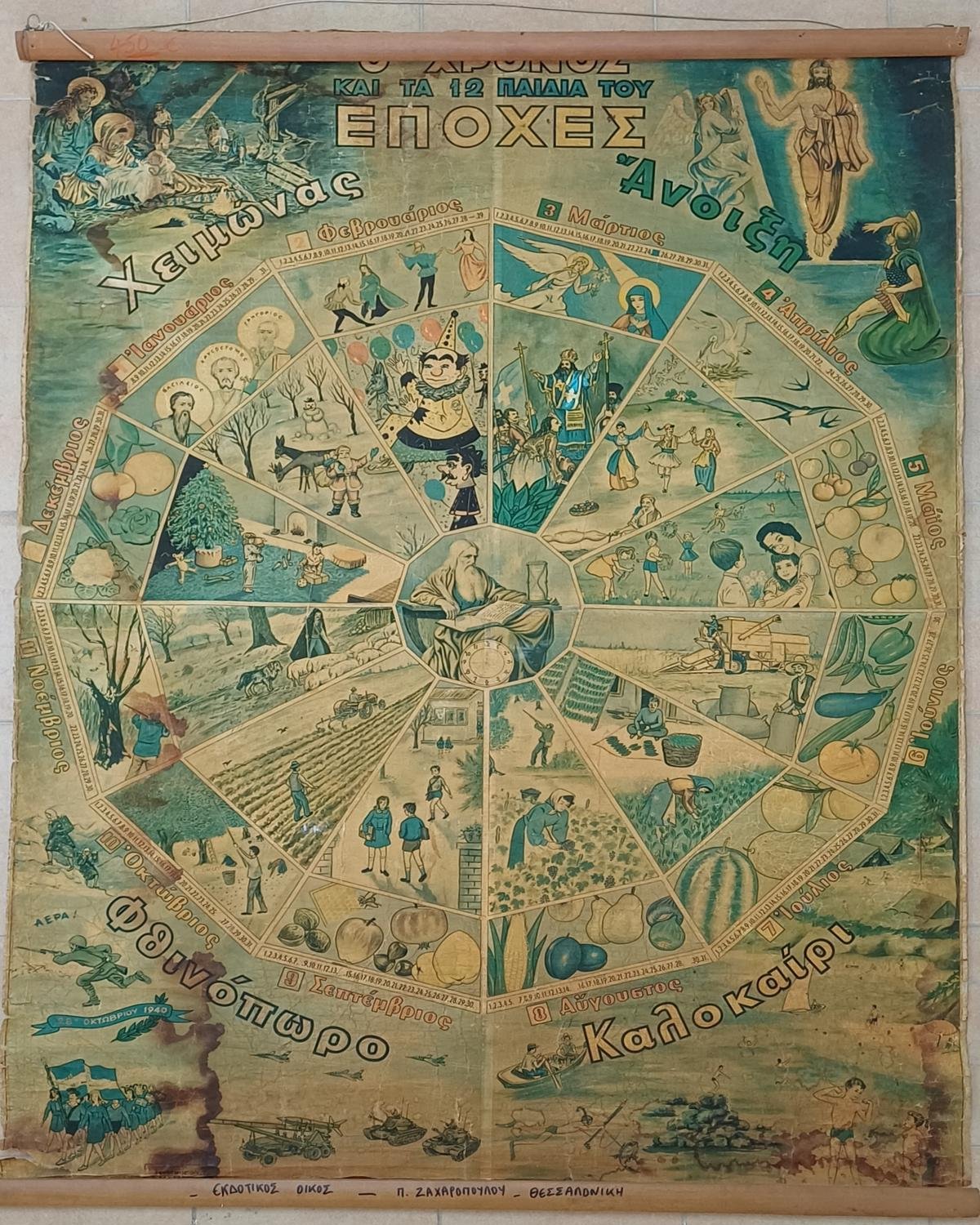 Λιθόγραφος σχολικός χάρτης ο οποίος είναι κατασκευασμένος από χαρτί φοδραρισμένο σε καμβά, με τα αρχικά του ξύλα. Απεικονίζει τους μήνες του χρόνου και τις 4 εποχές. Αναγράφεται ο εκδοτικός οίκος Π. Ζαχαρόπουλου (Θεσσαλονίκη). Οι εμφανείς φθορές στον χάρτη υποδηλώνουν την παλαιότητά του. Τα χρώματα έχουν ξεθωριάσει και υπάρχουν κάποια σκισίματα κυρίως περιμετρικά. Παρόμοιος χάρτης εκτίθεται στο Μουσείο Εκπαίδευσης Αγίου Δημητρίου. Οι διαστάσεις του είναι 1,89*1,34.