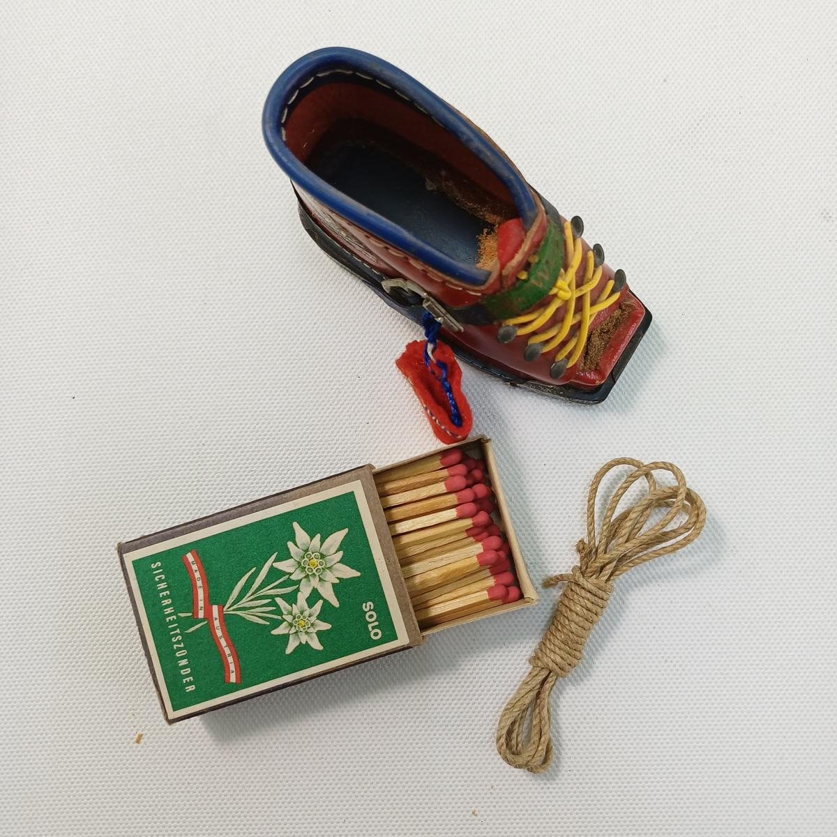 Vintage souvenir Αυστρίας σε σχήμα μπότας με σπίρτα, σχοινί ορειβασίας και παραδοσιακό καπελάκι. Η μπότα φέρει το λουλούδι εντελβάις στο πλάι, το οποίο είναι ένα γνωστό αλπικό σύμβολο που συνδέεται με την Αυστρία, την Ελβετία και τον αλπικό πολιτισμό γενικότερα. Στο εσωτερικό της μπότας υπάρχει ένα κουτί γεμάτο με σπίρτα το οποίο φέρει την ετικέτα “SICHERHEITSZÜNDER”, που στα γερμανικά σημαίνει “Σπίρτα ασφαλείας”. Στο κάτω μέρος της μπότας αναγράφεται η χώρα κατασκευής “Made in Austria”.